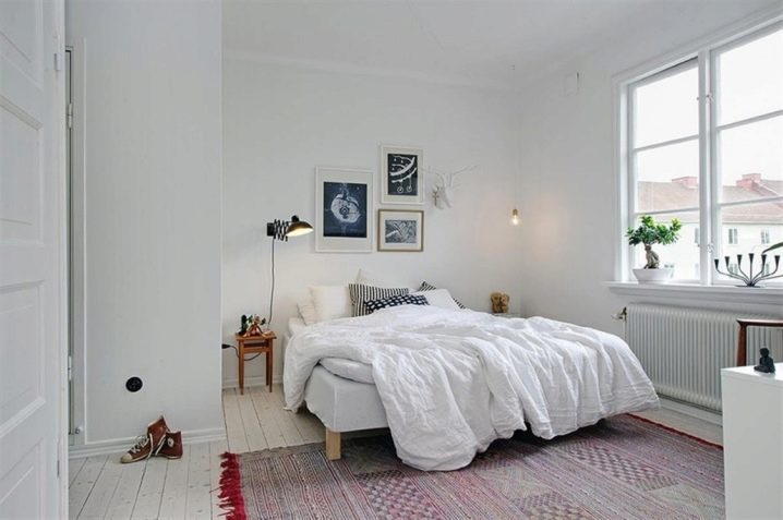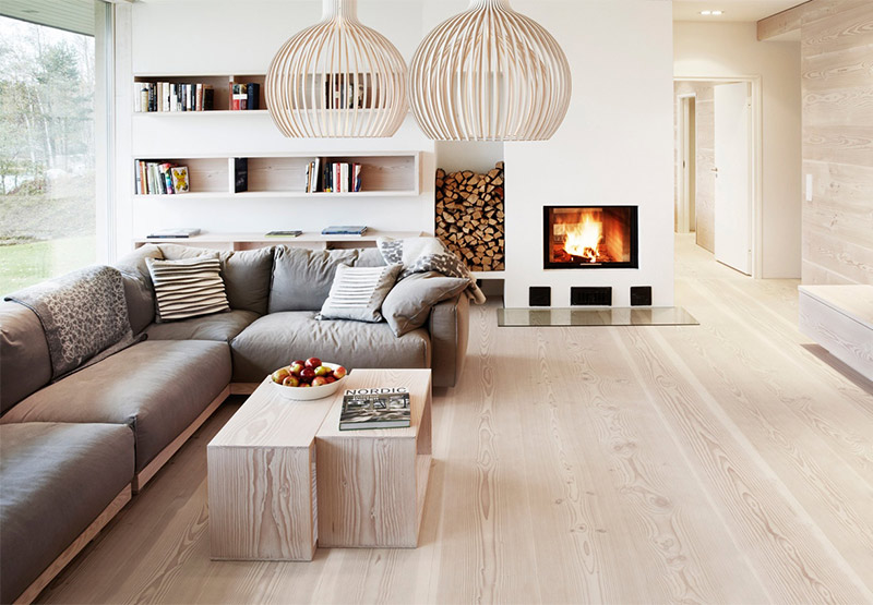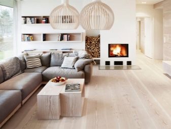 Lorsque le style scandinave est choisi pour l'ensemble de la pièce, il est logique de préférer un blanc ou une autre teinte très claire du revêtement de sol. Dans le style du pays, il convient d'imiter la coloration de types de bois coûteux (mais non exotiques, mais poussant dans notre pays).