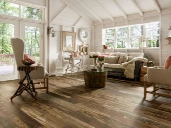 Vintage parfaitement démontré par divers matériaux naturels, de préférence vieillis artificiellement. Les solutions vintage ont toujours et partout un style élégant, un attrait irrésistible. Il associe parfaitement un sol particulièrement démodé à des antiquités et à des objets généralement anciens. Ce style nécessite d'abandonner tout excès et prétention. Donc, si vous avez besoin d’une pièce remplie de décor et de décorations, vous devriez choisir un style différent, plus adapté à votre loisir.