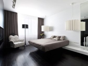 La chambre, décorée dans l'esprit art déco, nécessite l’utilisation d’un sol noir ou blanc. Ou une couleur différente, mais toujours combinée avec les mêmes tons et la peinture métallisée (généralement utilisée dans un tel intérieur).