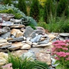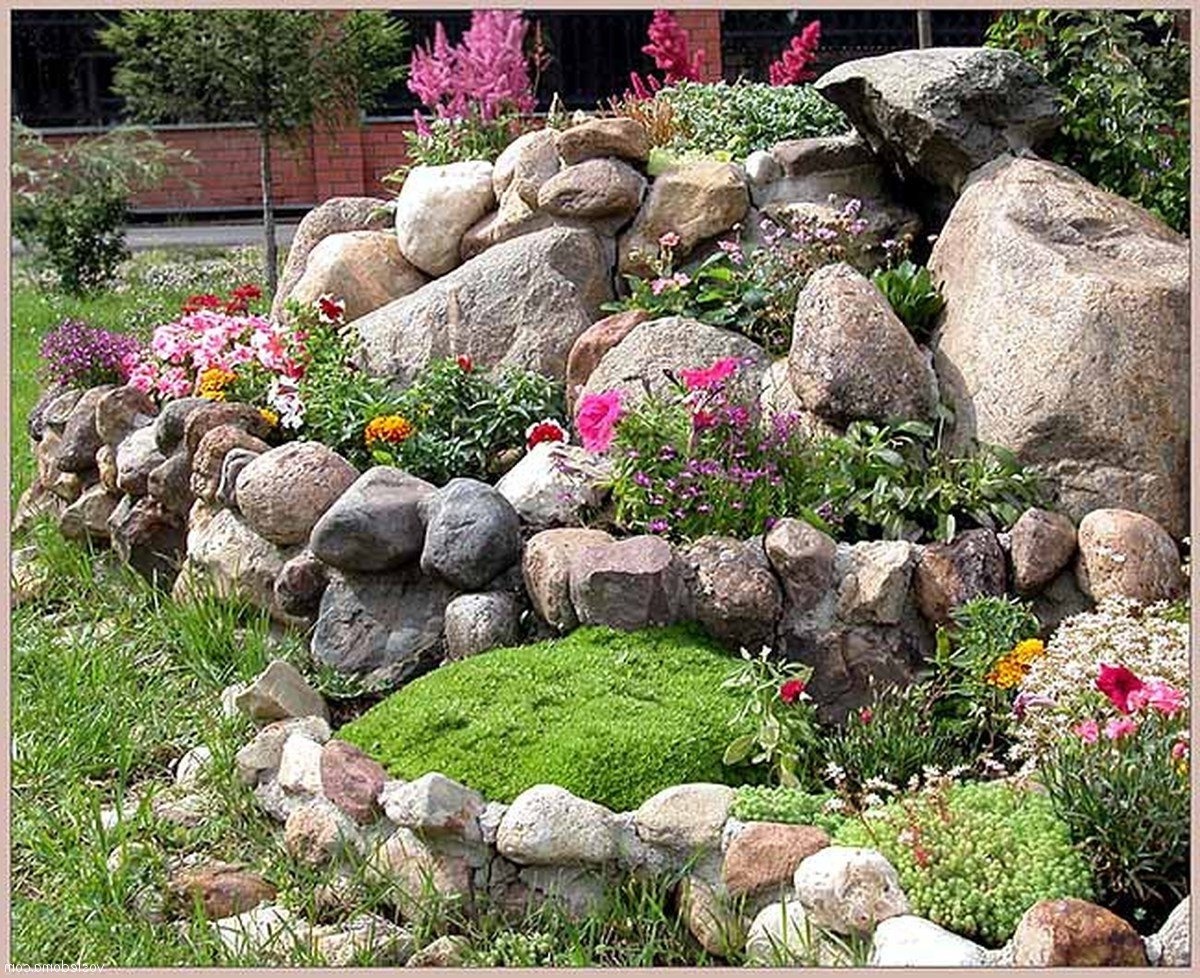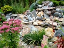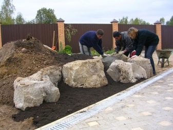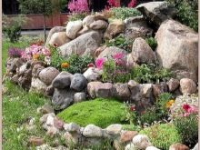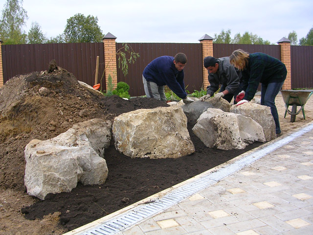 Sur le périmètre de la colline, placez les plus grosses pierres. Pour donner un design naturel et un meilleur attelage, ils sont enfoncés dans le sol d’au moins 1/3. Des pierres avec des défauts sont posées pour le cacher. Les parties de pierres visibles doivent être aussi attrayantes que possible. Ayant des rochers, il est nécessaire de laisser un espace entre eux pour que les plantes et les fleurs puissent le remplir en grandissant. En outre, lors de la pose de pierres, vous devez essayer de créer un cluster naturel afin que la composition soit aussi naturelle que possible.