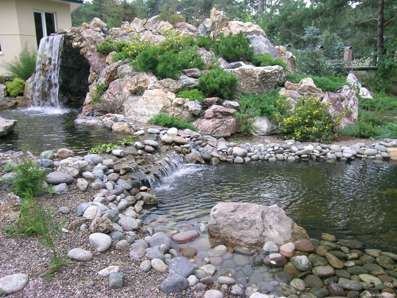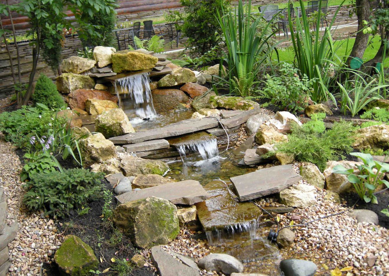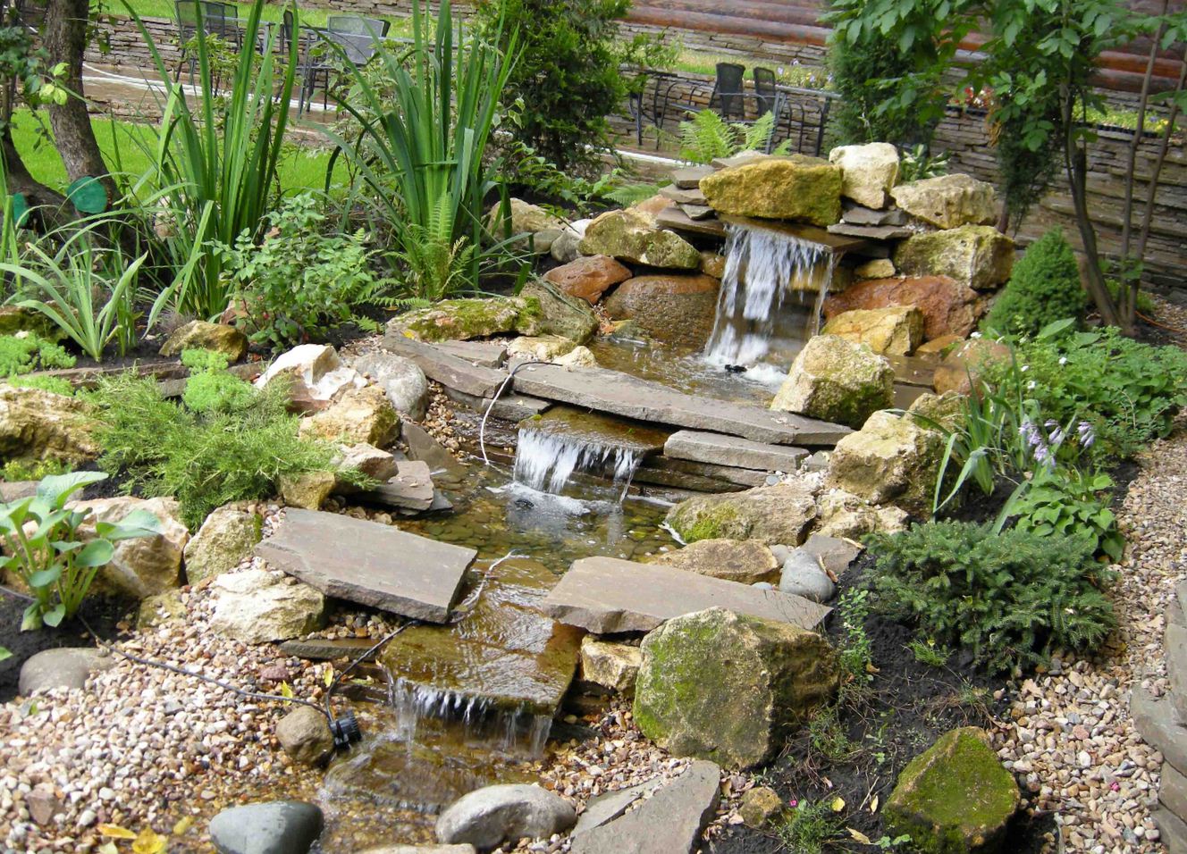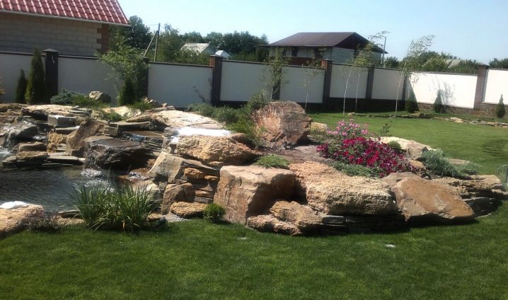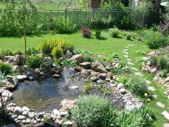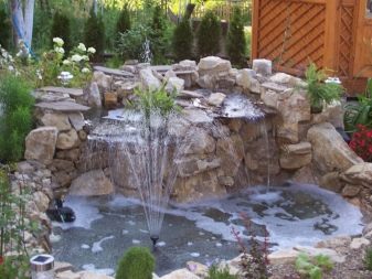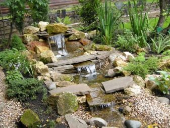 En choisissant cette option de décoration, vous devez tenir compte du fait que pour organiser la cascade, vous devez placer une pompe submersible à l'intérieur du réservoir, car le réservoir sous pression qui fournit la pression d'eau nécessaire n'est pas facile à dissimuler la rocaille parmi les plantes. En outre, il est important de prendre en compte le fait que, sous les rayons directs du soleil, l’eau de l’étang commencera à fleurir et doit donc être placée à l’ombre.Les types d'arbustes à feuilles caduques ne doivent pas être plantés près de l'eau, sinon le réservoir devra être constamment nettoyé du feuillage.