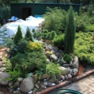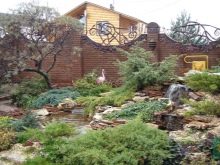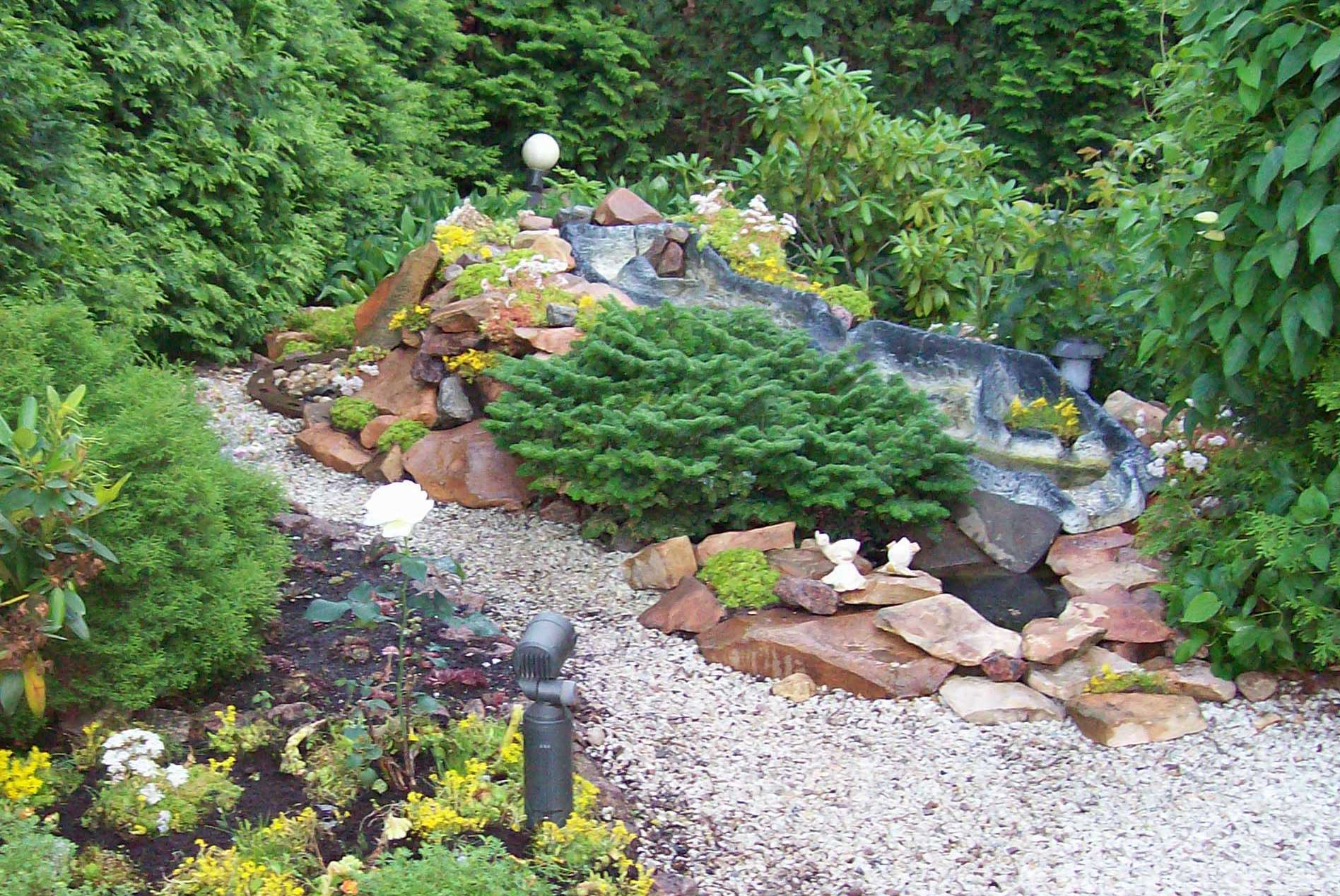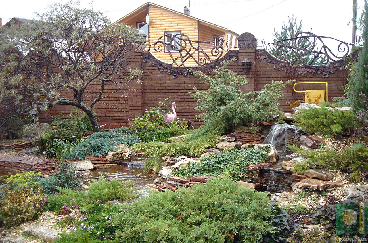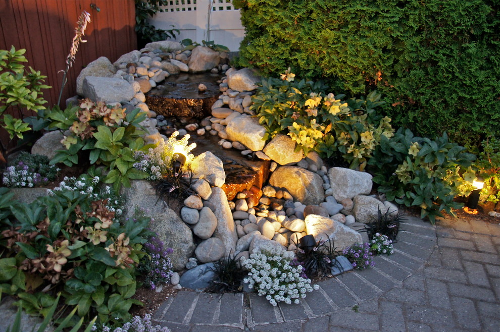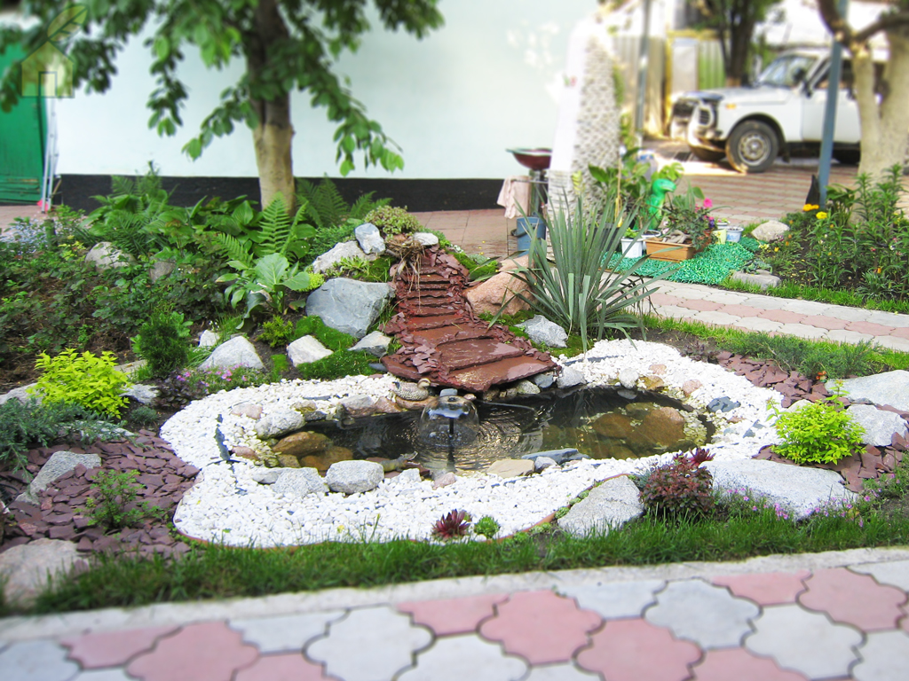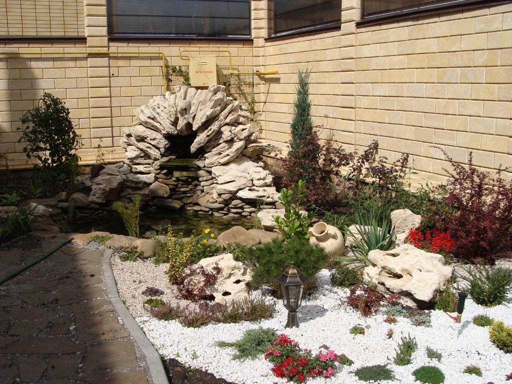 En choisissant cette option de décoration, vous devez tenir compte du fait que pour organiser la cascade, vous devez placer une pompe submersible à l'intérieur du réservoir, car le réservoir sous pression qui fournit la pression d'eau nécessaire n'est pas facile à dissimuler la rocaille parmi les plantes. En outre, il est important de prendre en compte le fait que, sous les rayons directs du soleil, l’eau de l’étang commencera à fleurir et doit donc être placée à l’ombre.Les types d'arbustes à feuilles caduques ne doivent pas être plantés près de l'eau, sinon le réservoir devra être constamment nettoyé du feuillage.
