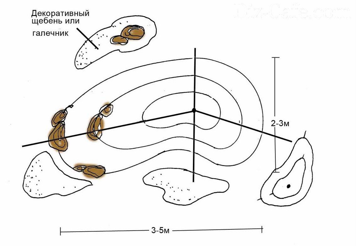 - Le choix de l'emplacement pour l'emplacement de la rocaille et un marquage préliminaire de ses limites et de sa forme sur le site.