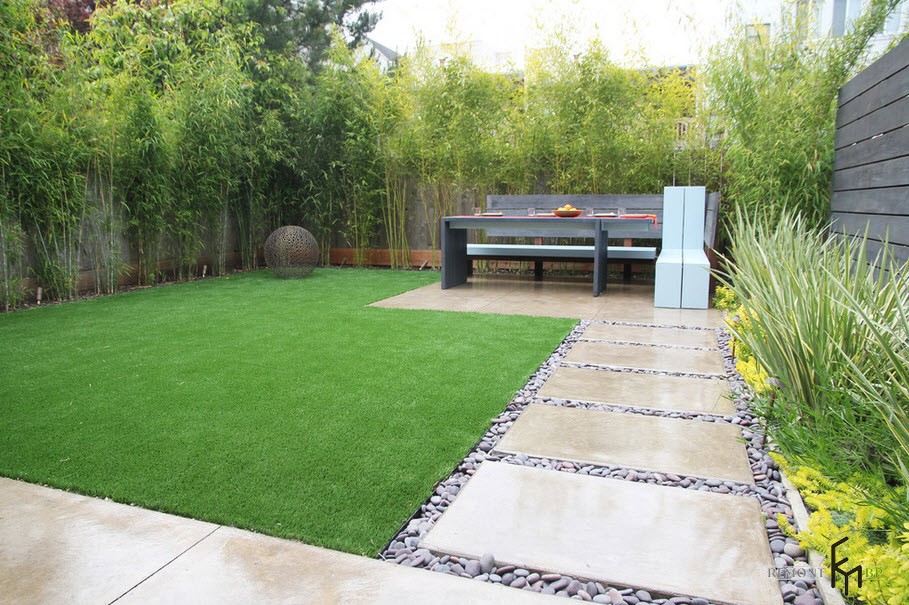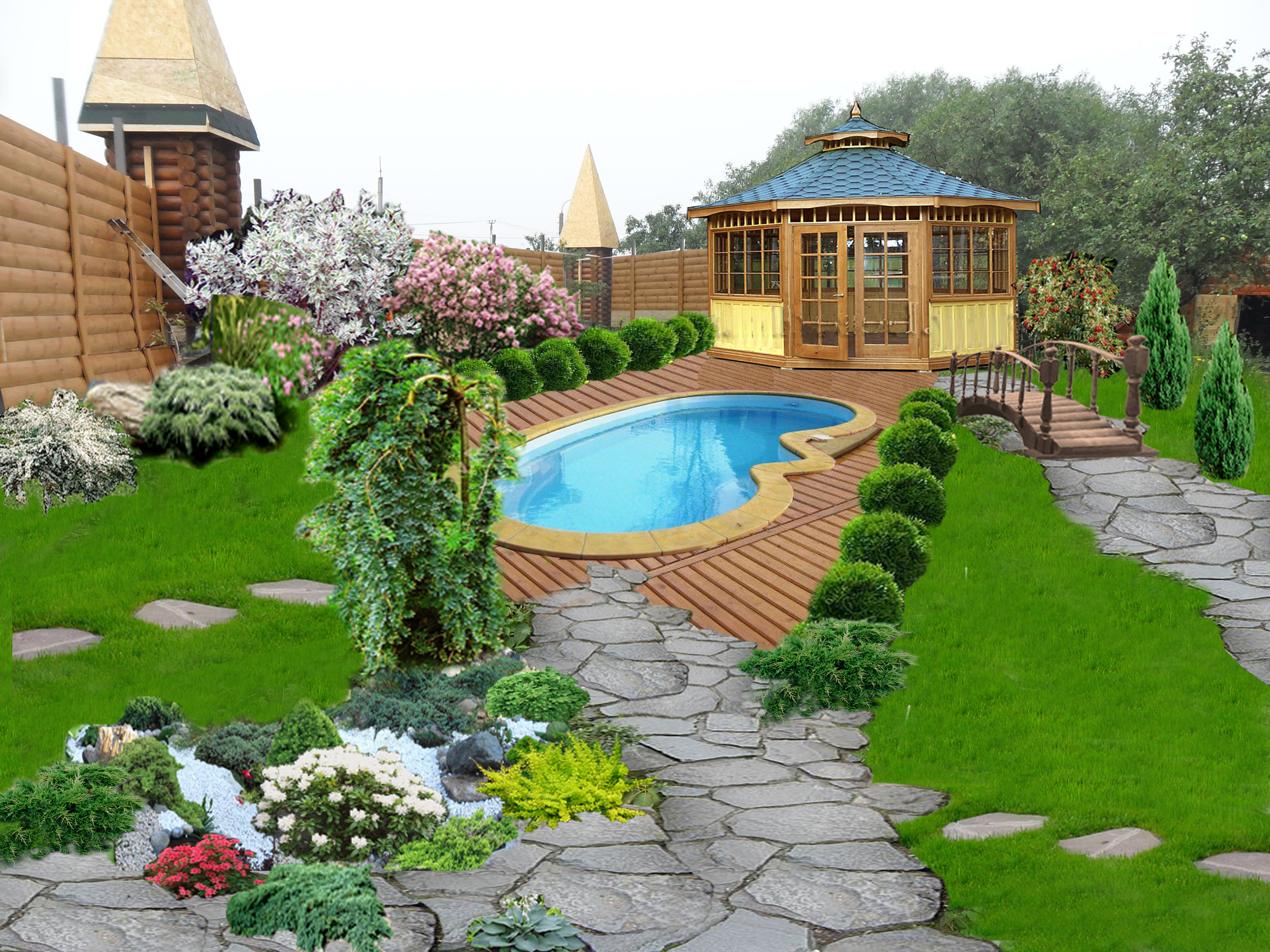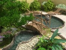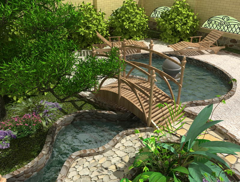 Le petit complot peut être publié dans le style japonais. Un tel exemple de conception paysagère combine des éléments d’eau, des chemins de pierre et des plantes. Objet de l'eau est préférable d'ajouter un pont.