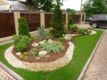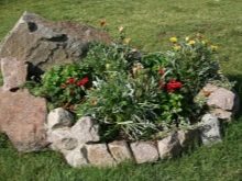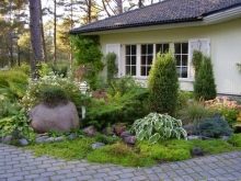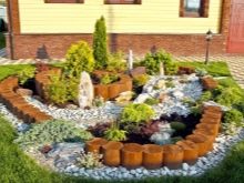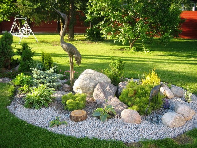 Une autre option de conception - l'utilisation de grosses pierres, pavés.Près d'eux peuvent être situés des plantes et des petits cailloux.