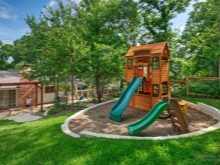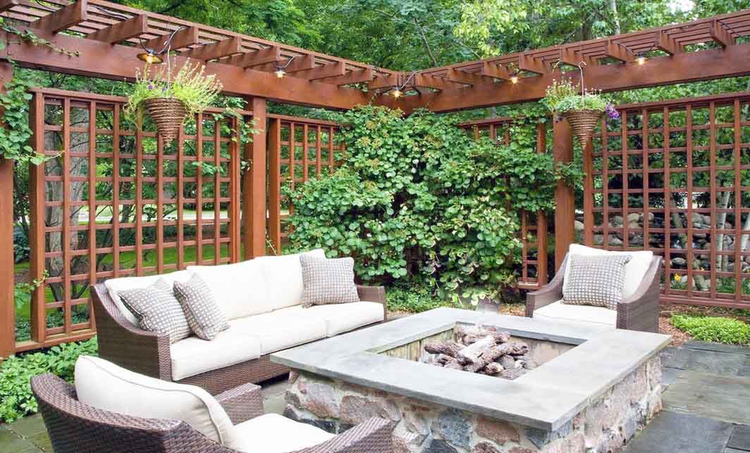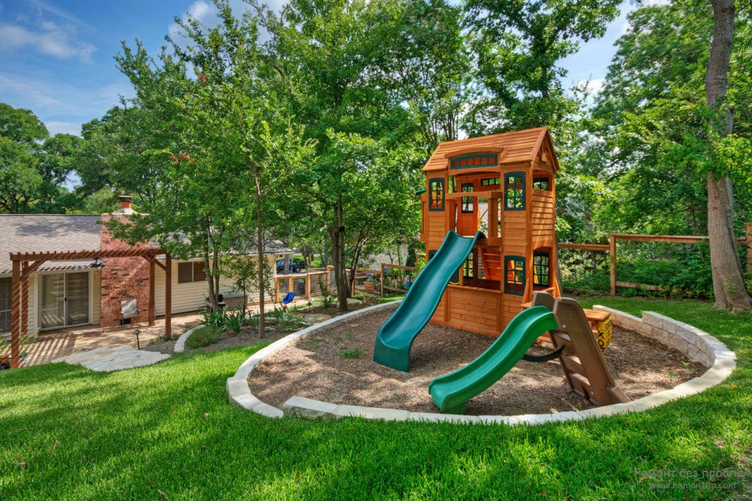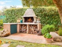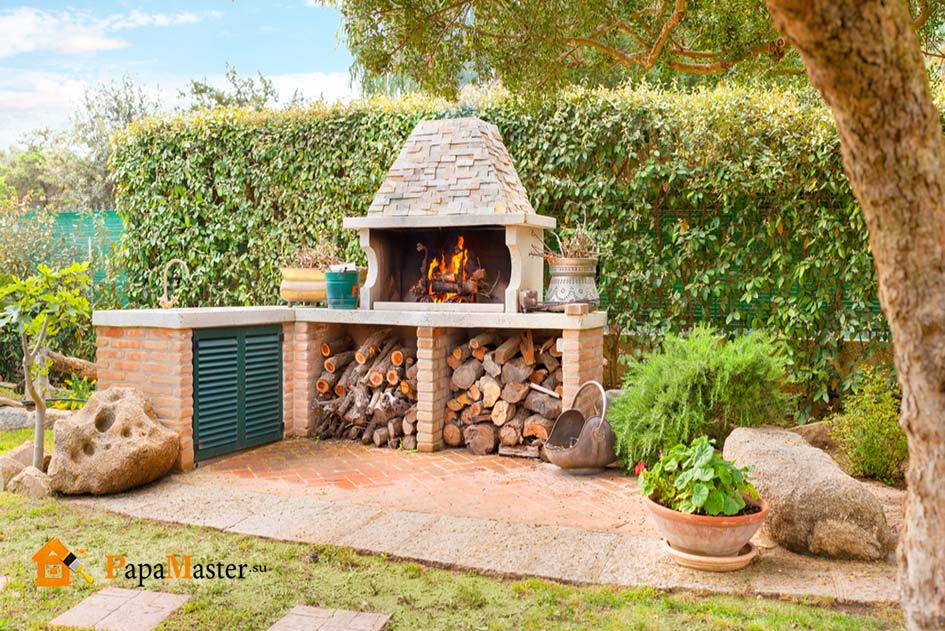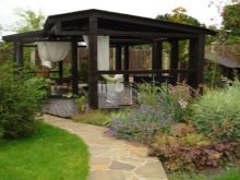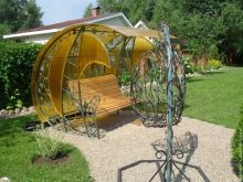 Une autre option de décoration est l'installation de petites structures architecturales. Il peut s'agir de mini-belvédères, balançoires, cuisinières et cuisines extérieures, ainsi que d'autres bâtiments élégants. Ils peuvent simultanément combiner style et fonctionnalité. Près du poêle, vous pouvez magnifiquement décomposer le bois.