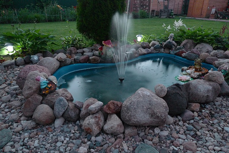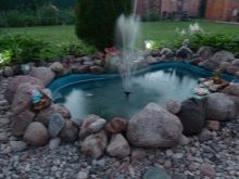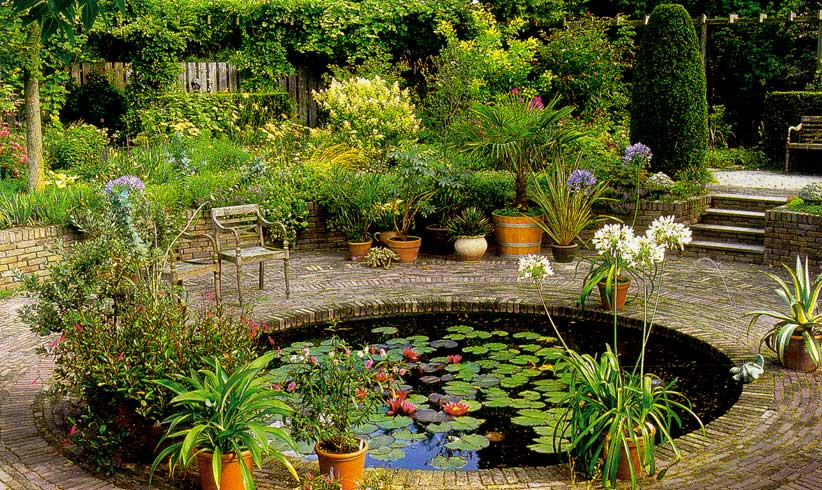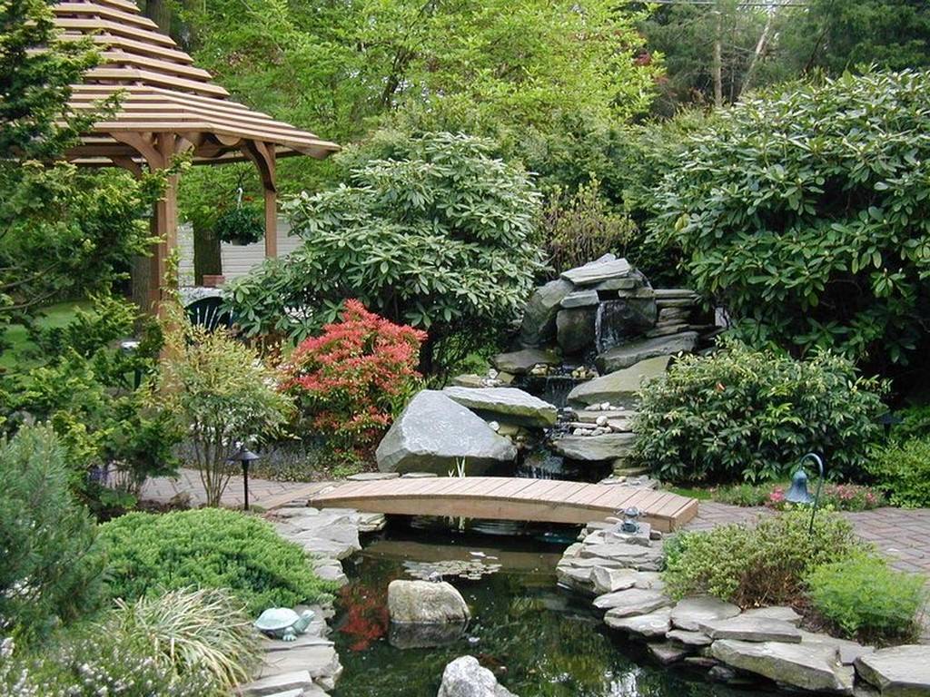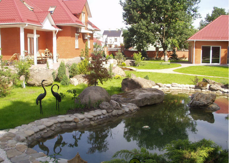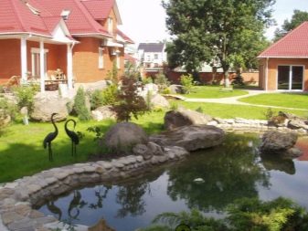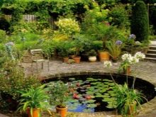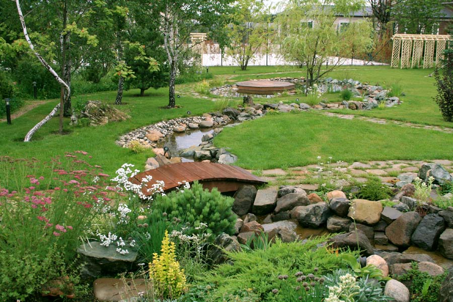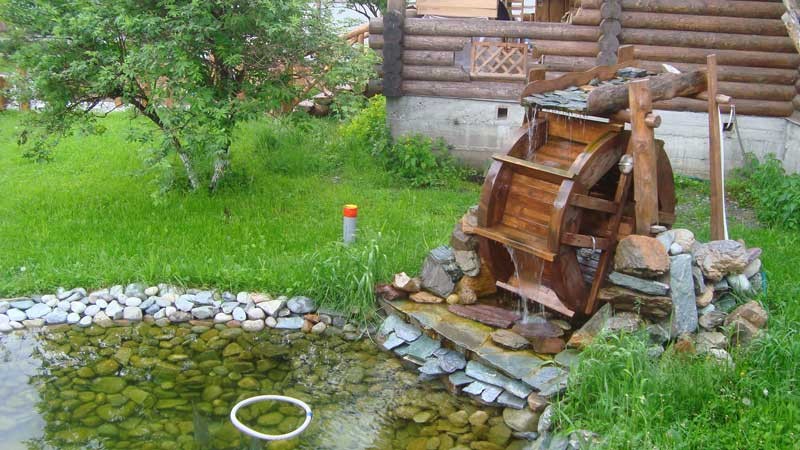 Le prochain élément décoratif - les réservoirs. Il peut s'agir de petits étangs, ruisseaux, fontaines, cascades. Il a l'air magnifique étang, près de la rive de laquelle est un moulin à eau. Ce détail décoratif ajoute de l'élégance. De tous les réservoirs que vous pouvez créer de vos propres mains, un étang est plus adapté aux débutants. Il est plus facile de l'équiper et ne nécessite pas de soins particuliers. En outre, vous pouvez y exécuter des lis de poissons et de plantes et d'autres plantes aquatiques.