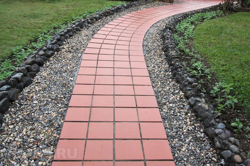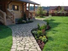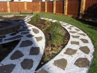 Des pierres naturelles et artificielles sont utilisées pour couvrir les pistes. Vous pouvez y mettre du gravier, de la pierre concassée. C'est aussi simple, mais en même temps fonctionnel, car il ne permet pas à l'eau de s'accumuler sur les bords du chemin.