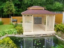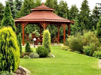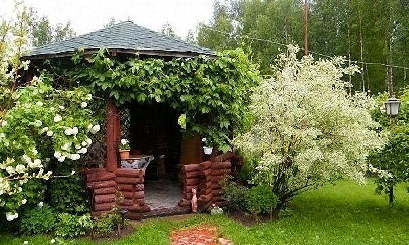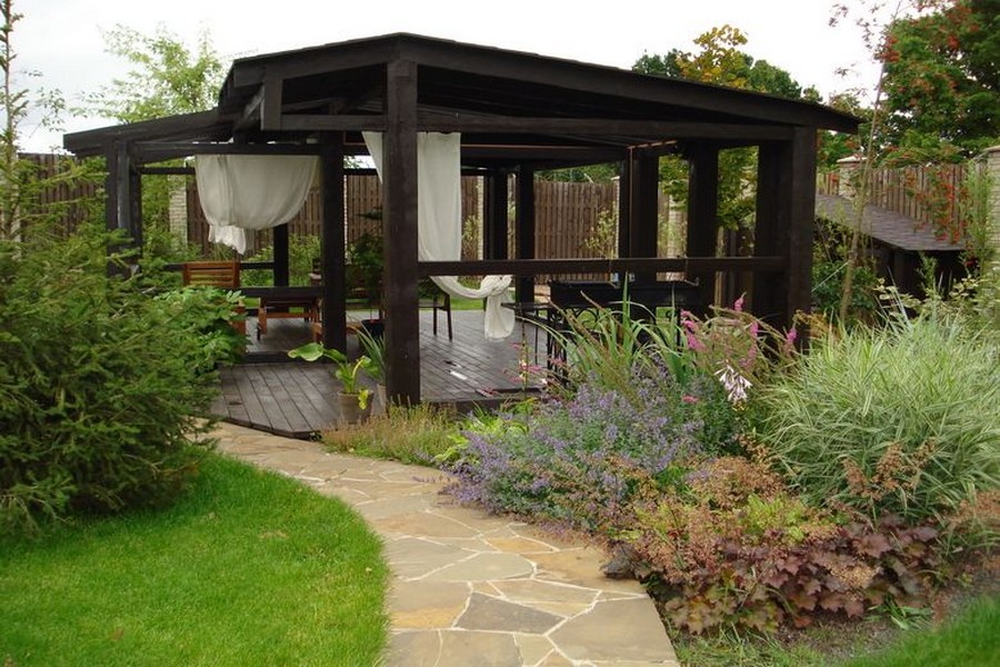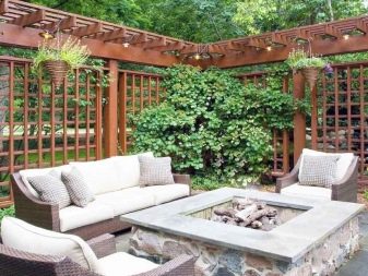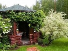 Dans la zone de loisirs près du belvédère, il est préférable de disposer des pots de fleurs et des pots élégants dans lesquels des fleurs lumineuses sont plantées. Il peut également être décoré avec des vignes et des lianes.