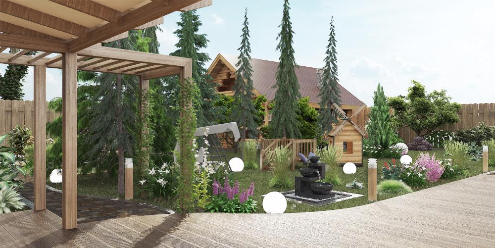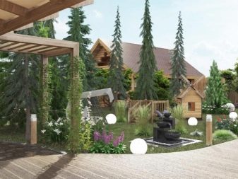 Pour une telle conception de paysage, il est préférable d'utiliser des plantes vivaces, pour la décoration de jardin, choisissez des clôtures et des bâtiments construits uniquement à partir de matériaux naturels.