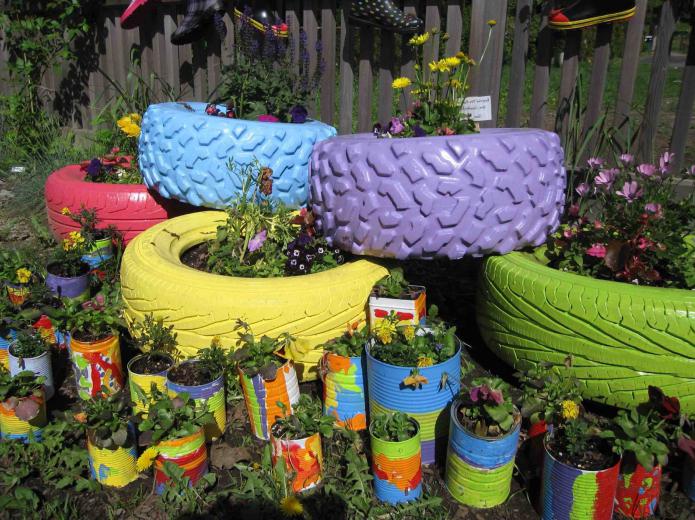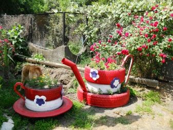 Vous pouvez décorer le site et les éléments des pneus. De tels métiers peuvent être facilement construits de manière improvisée. Ainsi, il peut s'agir de plates-bandes à plusieurs couches ou de pots de fleurs pour les plantes. Ils peuvent être placés dans n'importe quel ordre. De plus, de belles figures peuvent être fabriquées à partir de pneus.