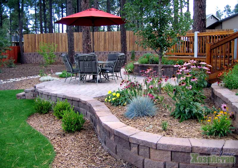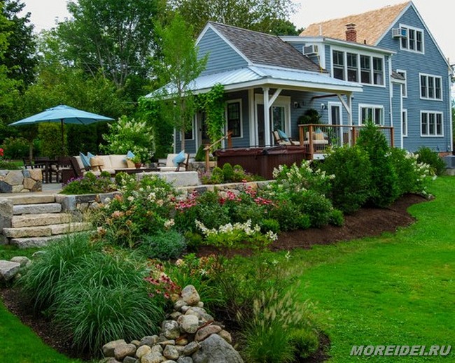 Si vous avez une pente sur le site, vous pouvez la diviser en zones à l’aide de différentes plantes et la partie inférieure pour soutenir les murs bas. Si vous avez une zone de collines, vous pouvez organiser des glissades alpines. Dans les zones avec une légère pente, vous pouvez faire des terrasses en pierre ou des pelouses.