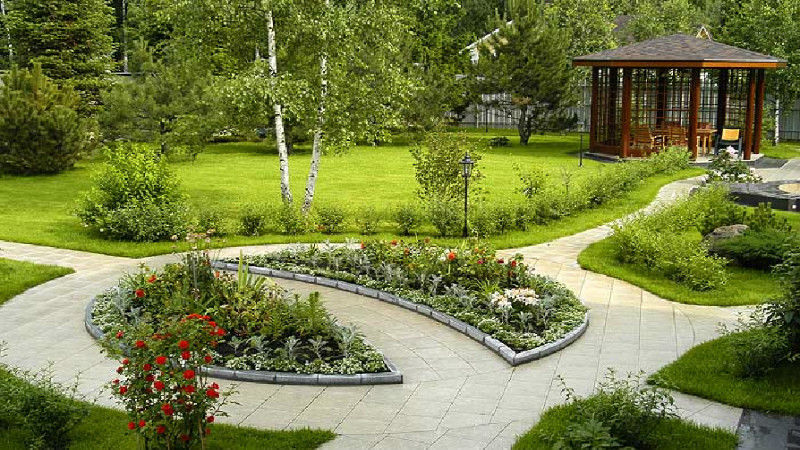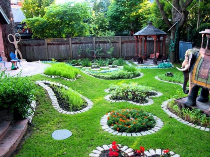 Si vous avez choisi une abondance de formes rondes sous la forme de parterres de fleurs, d’arbustes coupés, de cimes d’arbres, vous ne devez pas utiliser de types d’éléments de décoration aux angles aigus.