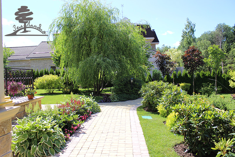 Une excellente solution pour le zonage est la disposition des allées de jardin. Pour les grands cottages, il est préférable d’utiliser des chemins géométriques - réguliers et droits.. Une option plus simple consiste à utiliser des pistes arbitraires, qui peuvent être à la fois étroites et larges et sinueuses. En outre, ils ont l'air plus intéressant et inhabituel.