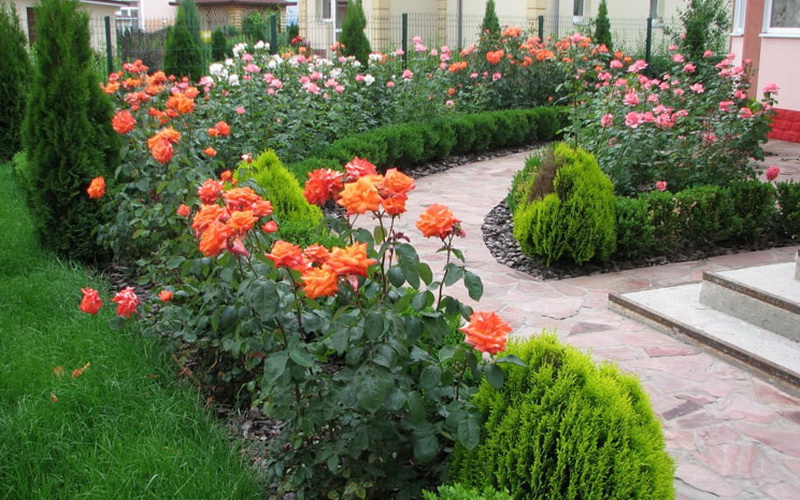 Pensez à la combinaison de chaque élément avec chacun, de sorte que le jardin de fleurs soit en harmonie avec la couleur du chemin qui y conduit, la maison correspond au jardin et à la haie - la porte et la tonnelle.