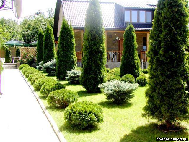 Lors du choix des plantes dans le jardin, il est nécessaire de prendre en compte la forme de leur couronne. Des designers expérimentés, qui planifient des coins verts, s’occuperont sûrement de la présence d’au moins un contraste. Pensez toujours quel élément deviendra central dans la signification. - arbre, fontaine, piscine, maison ou sculpture - et forment en conséquence le reste de la composition.