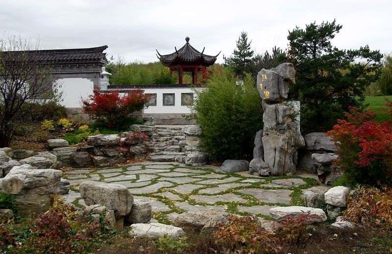 Pour donner l'impression d'une profondeur maximale, les plantes et les bâtiments les plus hauts sont éloignés de l'entrée et ceux de niveau inférieur, si possible, les rapprochent.
