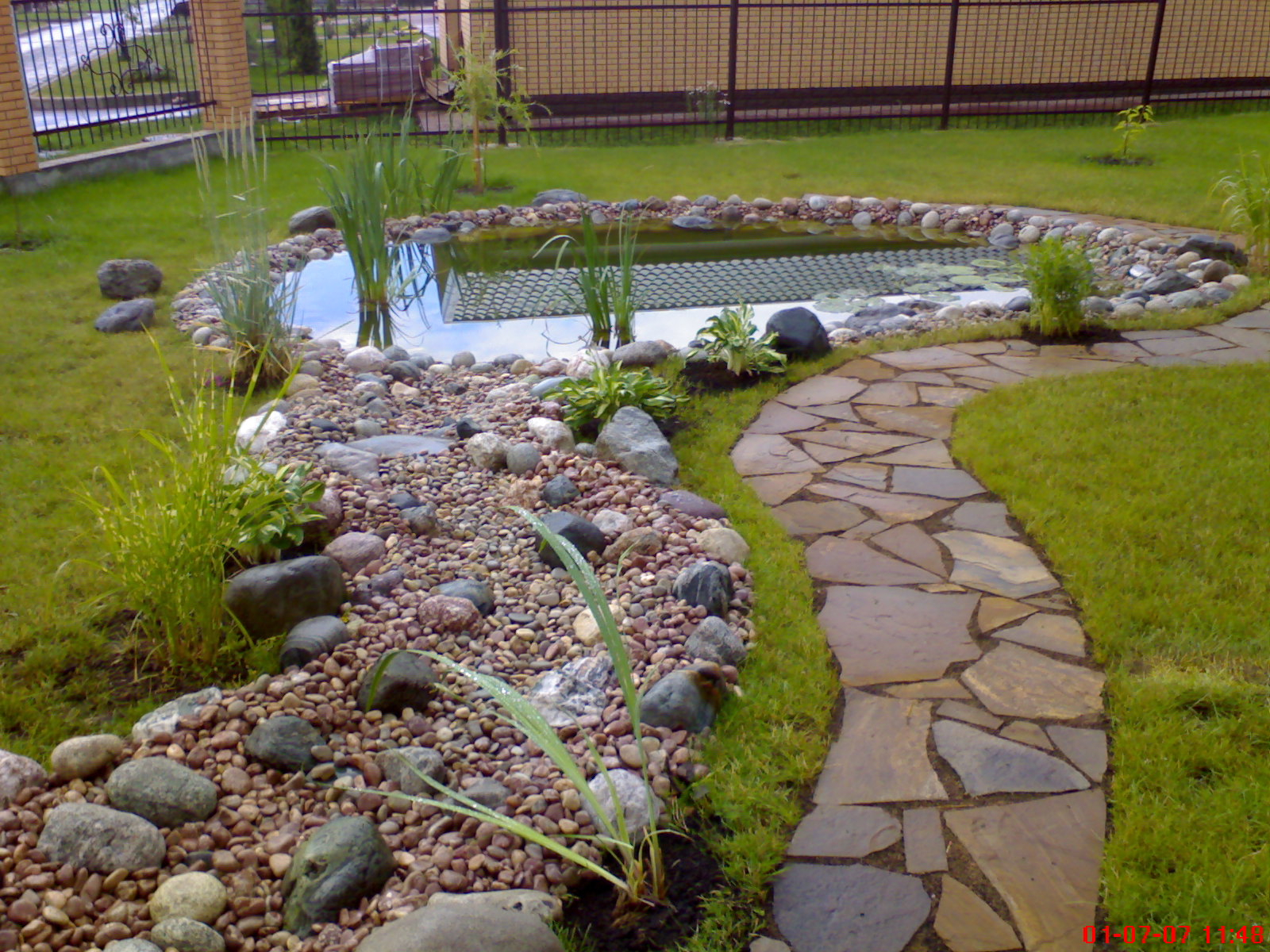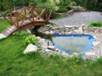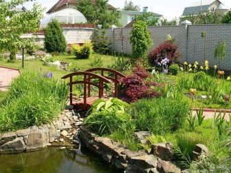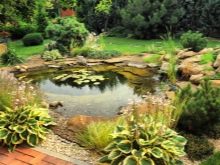Rentable dans l'espace de datcha regardera et réservoir artificiel d'une petite zone. Il peut être magnifiquement décoré avec de grosses pierres massives ou une forte plantation de différentes plantes. Vous pouvez également construire un pont de bois traversant l’étang. Cela donnera à l'aménagement paysager un aspect sophistiqué et agréable.