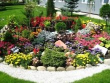 Toujours dans de telles zones de jardin, on recherchera de grands parterres de fleurs combinant plusieurs types de fleurs (roses, violettes, dahlias, tulipes, lys). De telles compositions créeront dans votre jardin une atmosphère agréable et confortable.Vous pouvez utiliser de petits parterres de fleurs, ce qui mettra l'accent sur la sophistication et la beauté de votre site.
