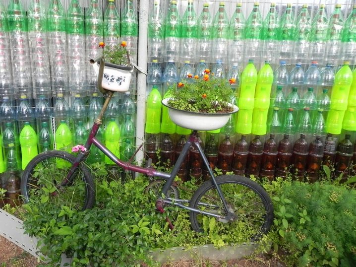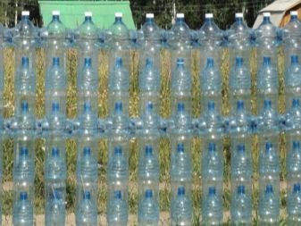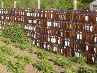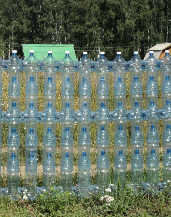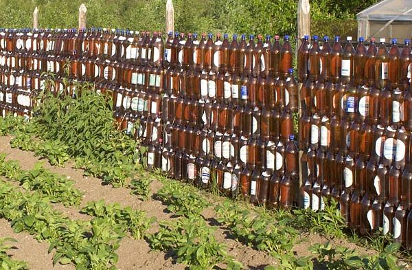 Une autre option est construire une clôture de bouteilles en plastique. Pour ce faire, ils coupent les fonds et les bouteilles sont insérées les unes dans les autres jusqu'à atteindre la hauteur souhaitée. Ces bandes de bouteilles sont attachées ensemble avec de la colle pour faire des boucliers. À l'avenir, les boucliers sont attachés aux supports.