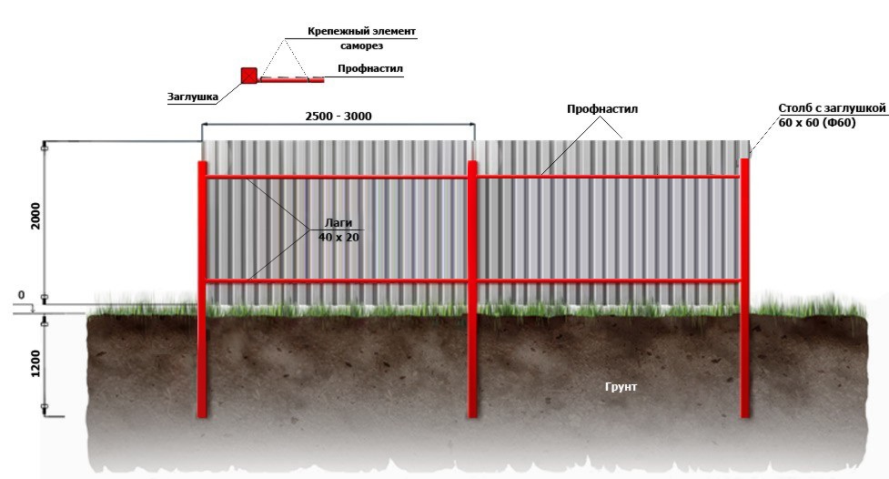 L’avantage incontestable de la construction d’une clôture à partir d’une feuille professionnelle est que vous n’avez pas besoin de faire un dessin préliminaire. Il suffit de marquer la position de la clôture, d'indiquer l'emplacement du portail et d'installer des goupilles de balise directement sur le site d'installation des piliers de support. Le pas entre eux devrait être compris entre 280 et 300 cm, en fonction de la charge de vent à laquelle la clôture sera soumise.