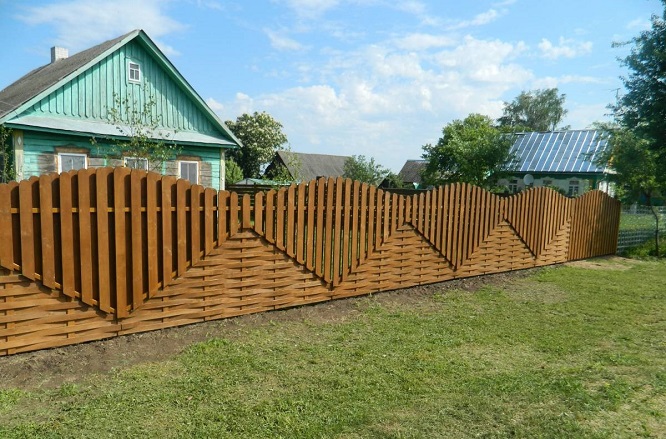 La clôture en osier semble distinctive. Il se combine bien avec une maison en rondins, mais contraste fortement avec la rue. Il est préférable de choisir ces options pour les bâtiments de pays.