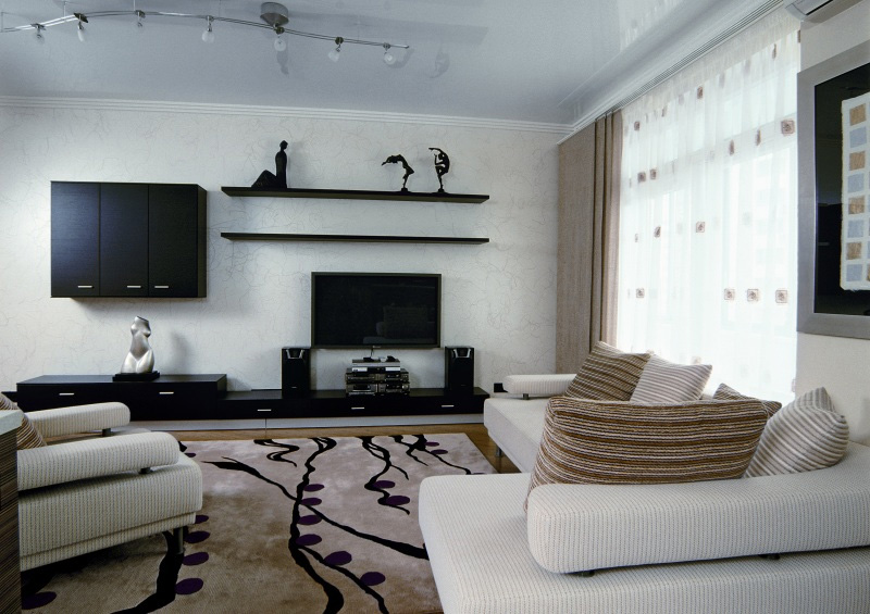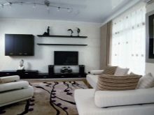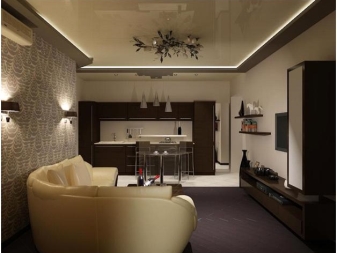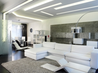 Dans l'appartement avec un design dans le style de "haute technologie", minimalisme, moderne ajustent harmonieusement des projecteurs élégants ou des panneaux LED. Ces produits n'empileront pas une pièce avec des plafonds bas, donneront une lumière douce et pourront être montés sur des plafonds suspendus et suspendus.