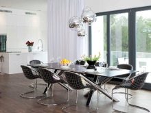 - L'appartement, décoré dans le style du minimalisme, ne tolère pas trop de détails - cela s'applique également aux lustres. Cependant, cela peut devenir un moment fort de l'intérieur, comme dans cet exemple: