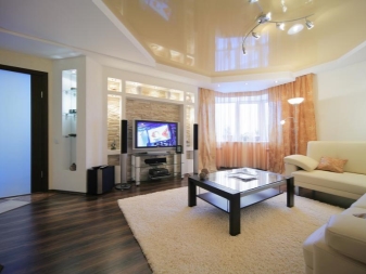 - Les spots s'intégreront harmonieusement dans la salle avec des plafonds tendus. Les lampes seront réfléchies par une telle toile et augmenteront visuellement le plafond et la pièce dans son ensemble. Voici une autre option élégante: