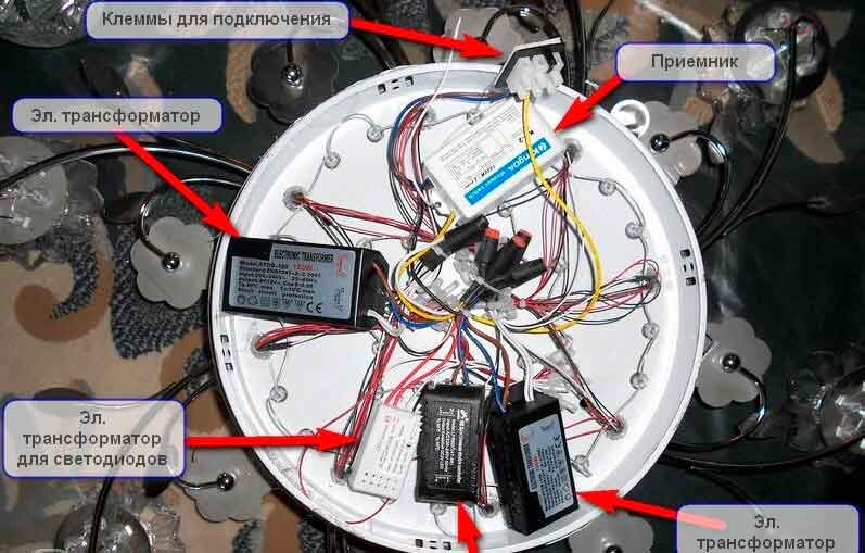 Le schéma de connexion est assez simple et est indiqué sur le corps des éléments internes du lustre. Un électricien expérimenté ne sera pas difficile d'installer le lustre. L'ensemble du système est situé à la base du luminaire et il suffit de le connecter à un interrupteur. La conception est montée avec quatre supports.L'unité de commande radio ou le contrôleur et le transformateur électronique restent à l'intérieur du lustre et sont soigneusement attachés l'un à l'autre.