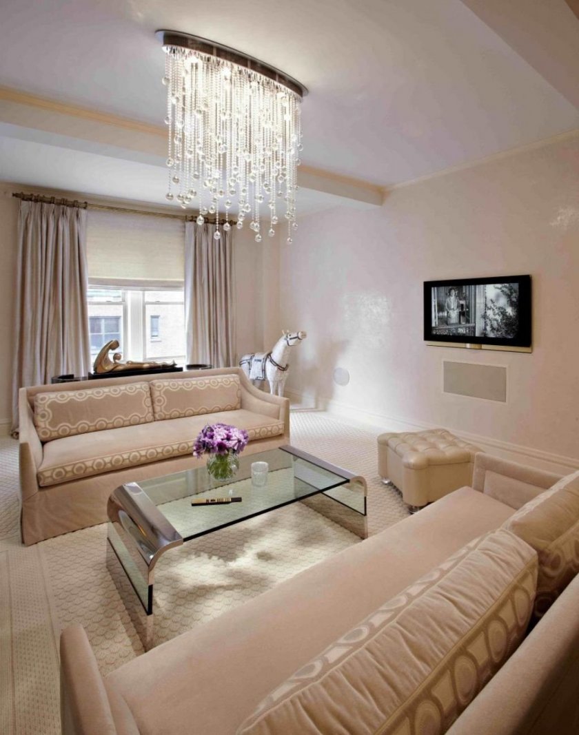 Lustre de forme inhabituelle s'intègre parfaitement à l'intérieur dans un style moderne. Mais lors de l'achat d'un tel modèle, il est important de se rappeler que de tels produits nécessitent un nettoyage long et fastidieux. Un lustre avec de nombreuses perles imitant la pluie convient à un salon de style parisien.