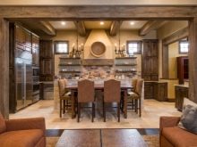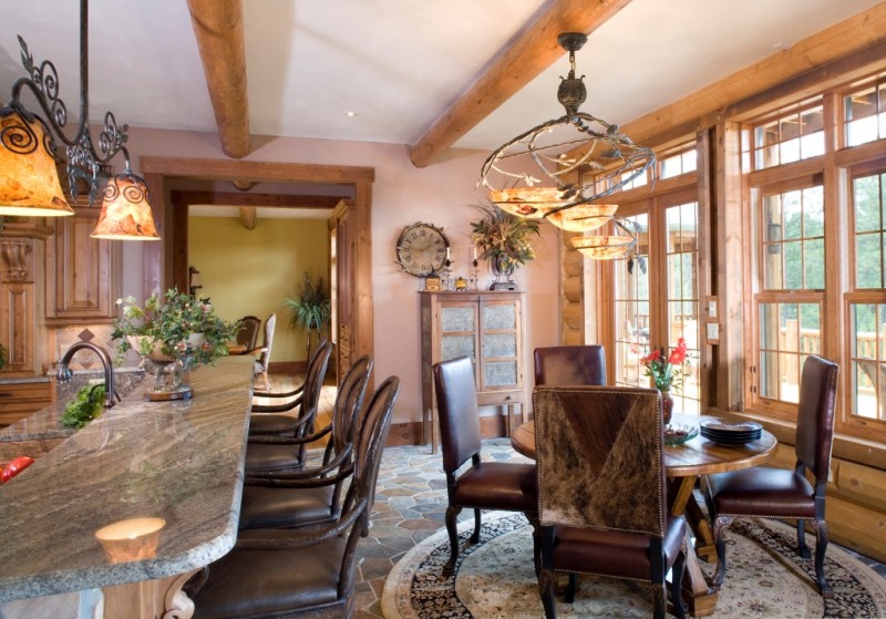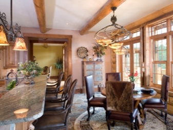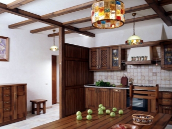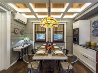 Si vous souhaitez diversifier le style rustique de la pièce, mais que vous ne voulez pas que cela ait l'air banal, faites attention aux lampes et aux lustres réalisés selon la technique Tiffany à l'aide de vitraux.De tels modèles compléteront parfaitement la salle de cuisine ou la salle.