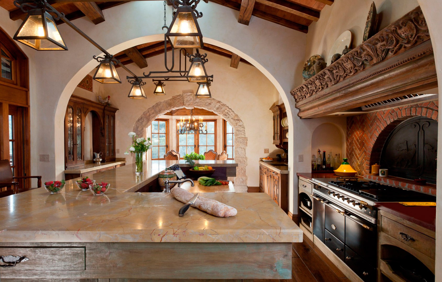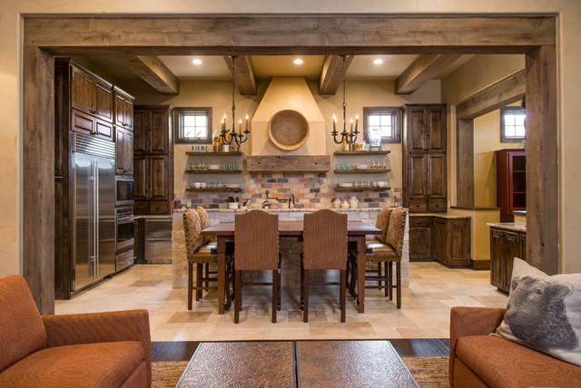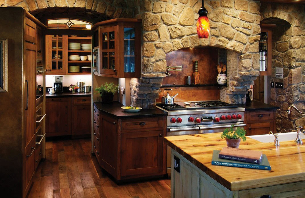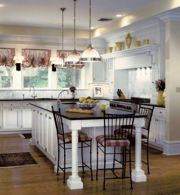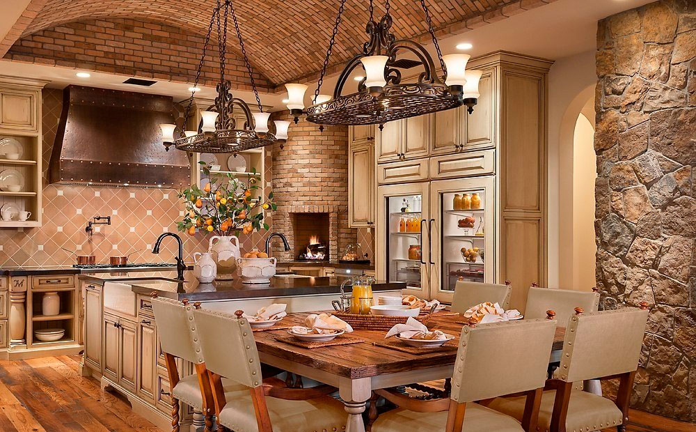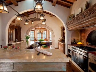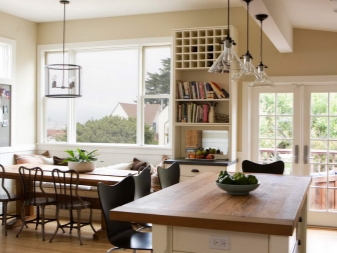 Si dans votre maison la cuisine est faite dans un style rustique, il sera alors très utile de la compléter avec un lustre avec une forge décorative et éventuellement des éléments textiles. En outre, les lustres de pays avec des nuances de verre de différentes formes ne sont pas moins élégants. Ils sont souvent placés dans la salle à manger principalement au-dessus de la table. En complément de cet intérieur, vous pouvez placer des lampes de sol de style similaire à un lustre ou à des appliques murales.