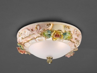 Dans les chambres à plafond bas, les lustres au plafond sont plus souvent installés. Ils sont montés directement au plafond, à l'aide d'un support fixé sur eux. En règle générale, les lustres de plafond sont des plafonniers en verre, en tissu, en métal ou en plastique. La luminosité de l'éclairage dépend de la transparence du plafond. Une telle version compacte sera une excellente solution dans les petites pièces.