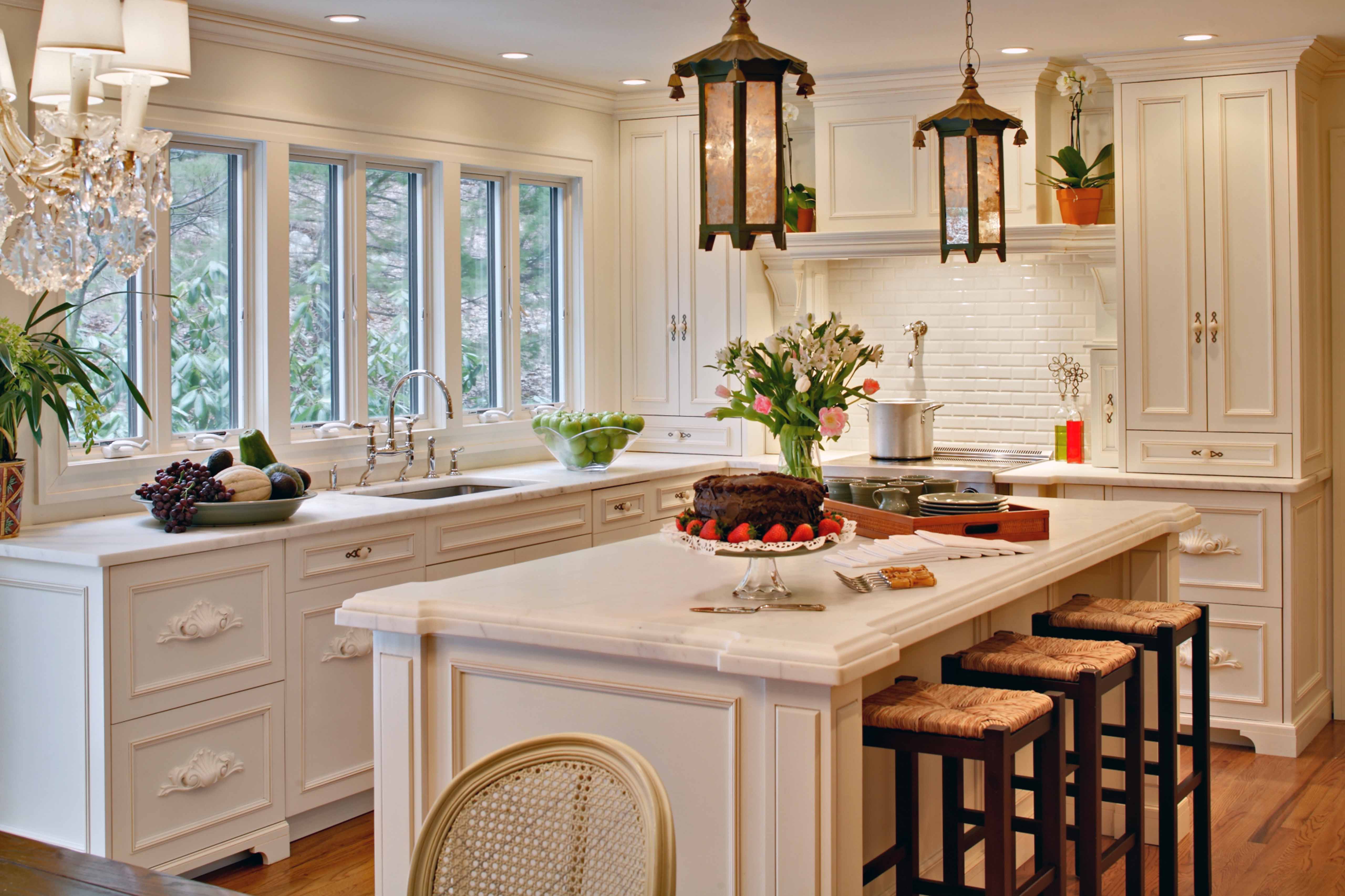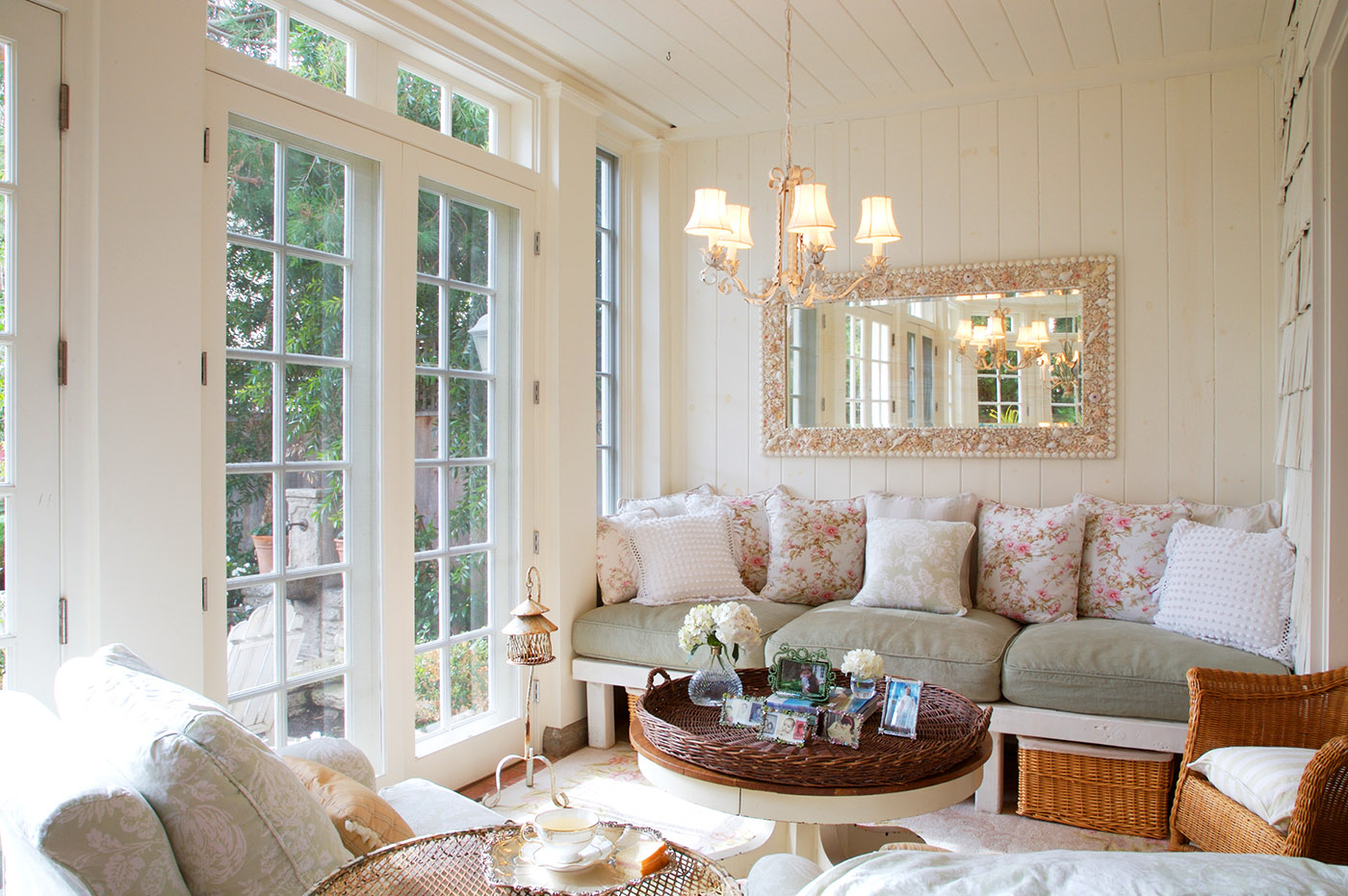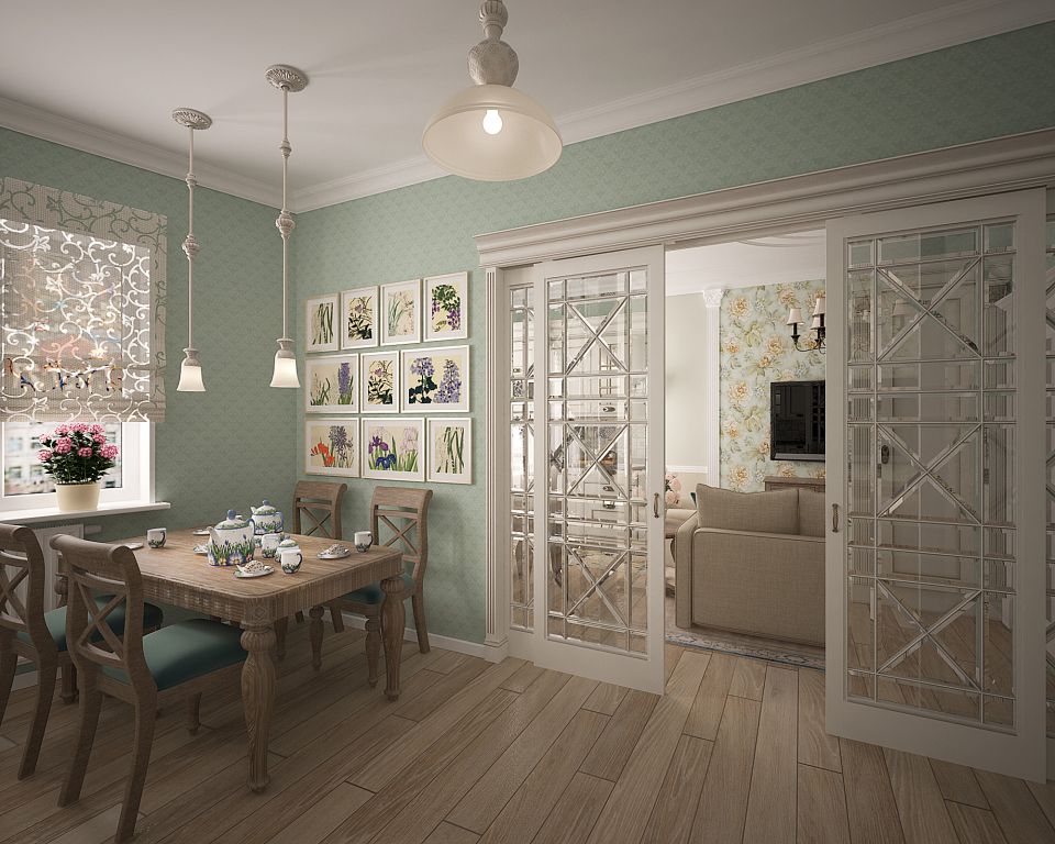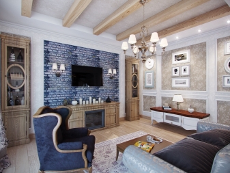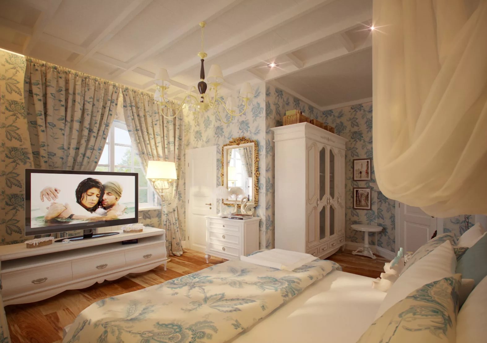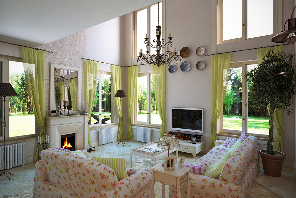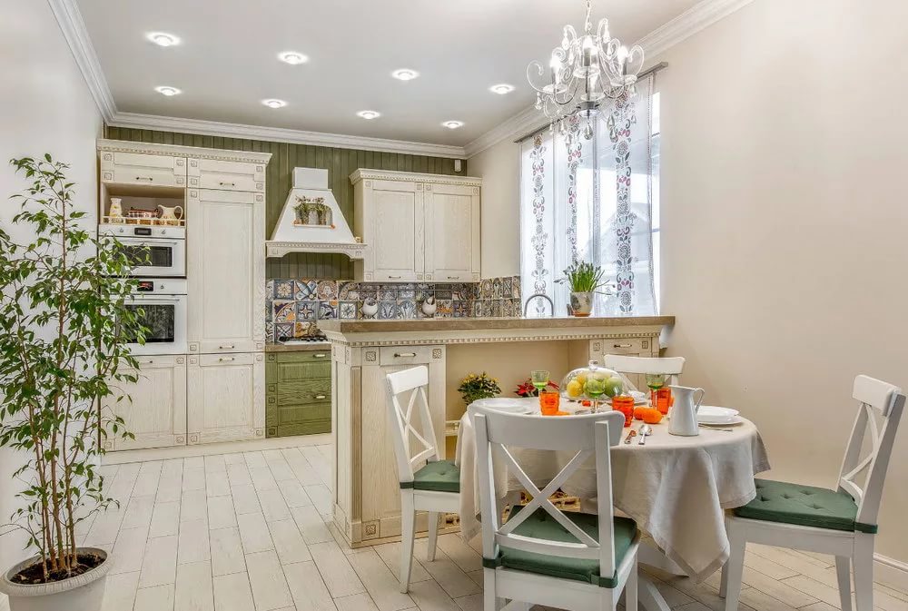 Le salon classique de style provençal est spacieux, lumineux, avec de grandes fenêtres, des vases avec des bouquets de fleurs fraîches et des motifs floraux traditionnels sur des textiles. Au centre de cette pièce se trouve un magnifique lustre à plusieurs étages de couleur laiteuse. De douces lampes à bougies et des pendentifs en cristal irisé emplissent l’esprit françaisle romantisme.