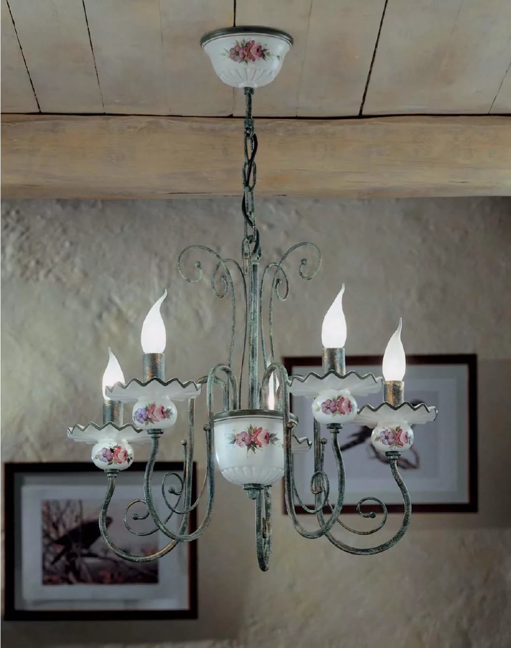 Les lustres de style provençal, comme tous les autres, se divisent en deux types: suspendu et plafonnier. Les suspensions consistent en un ou plusieurs plafonds fixés à un crochet spécial installé au plafond à l’aide d’une chaîne, d’un cordon ou d’une ficelle. La longueur du cordon peut être ajustée à volonté et la jonction des fils est masquée par une plaque décorative. Le type de construction suspendue est généralement utilisé dans les grandes pièces avec de hauts plafonds.