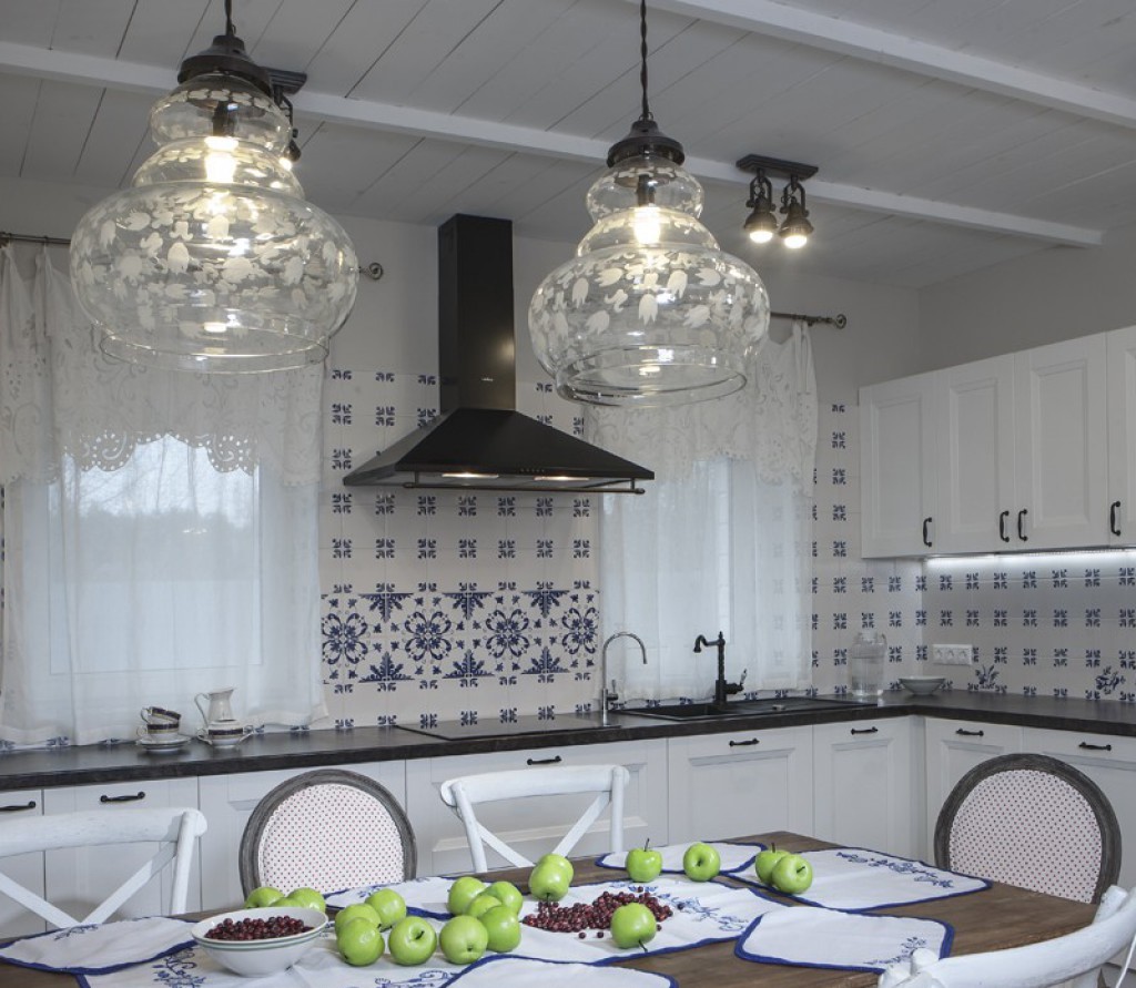 Dans la maison de campagne en bois rond de style provincial avec une solide cuisine en bois et des tons d'olive nobles, les lustres-lanternes s'intègrent si bien. Il semblerait qu’ils soient impolis et conçus pour la rue, mais ici, cela semble très approprié. Leur lumière douce au-dessus de la salle à manger remplit toute la pièce de confort et symbolise la chaleur de la maison.