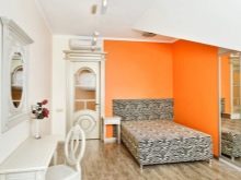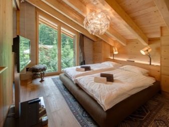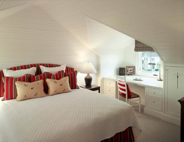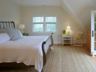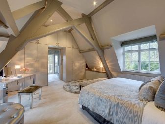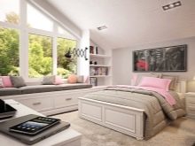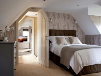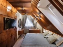 Organiser le grenier sous la chambre est facile, même si la perspective du toit a beaucoup de défauts. Les tons sont sélectionnés doux et légers. Le type de revêtement de surface préféré mat: le brillant crée un certain stress émotionnel.