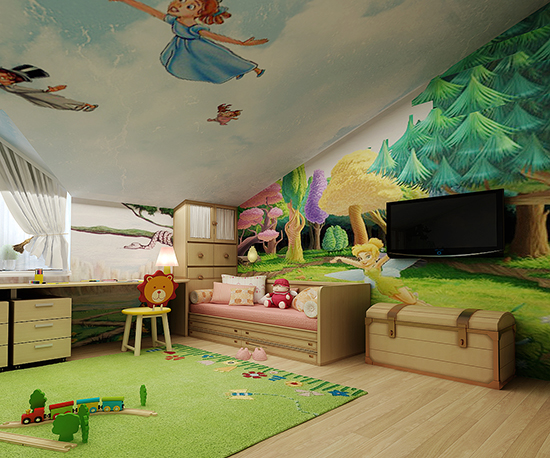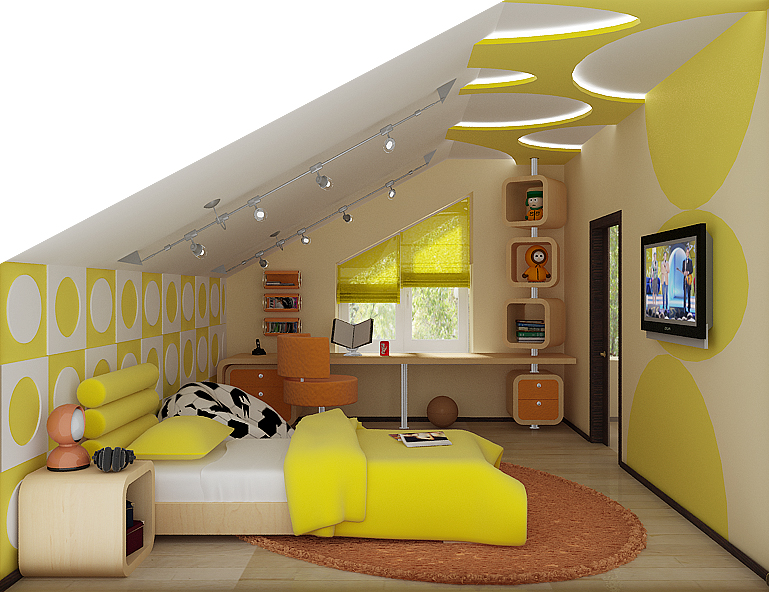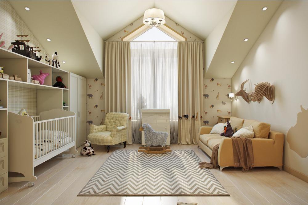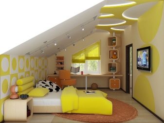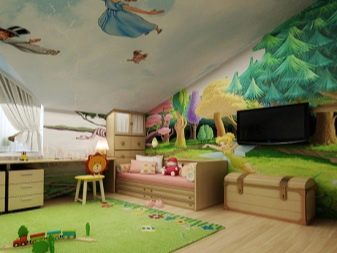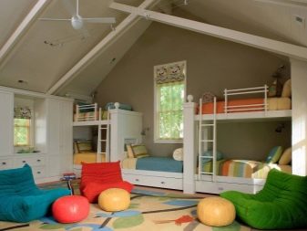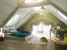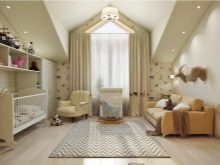 Aménager le grenier sous la pépinière, accorder une attention particulière à la sécurité. Les systèmes de toiture complexes sont exclus, l'espace et la liberté de mouvement sont importants. L'espace est divisé en 3 zones fonctionnelles,les délimitant par la construction de tapis ou de plafond moelleux. Selon l’âge, il s’agit d’une salle de jeux (espace de loisirs), d’un espace de travail et d’un espace de couchage.