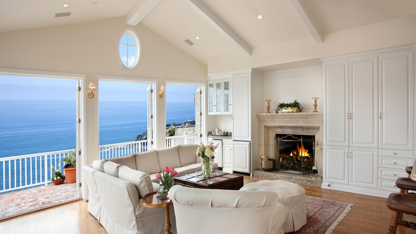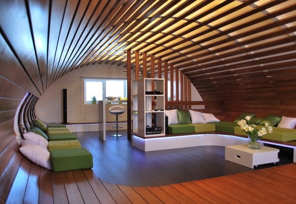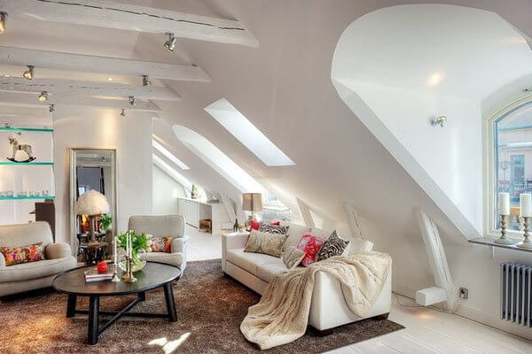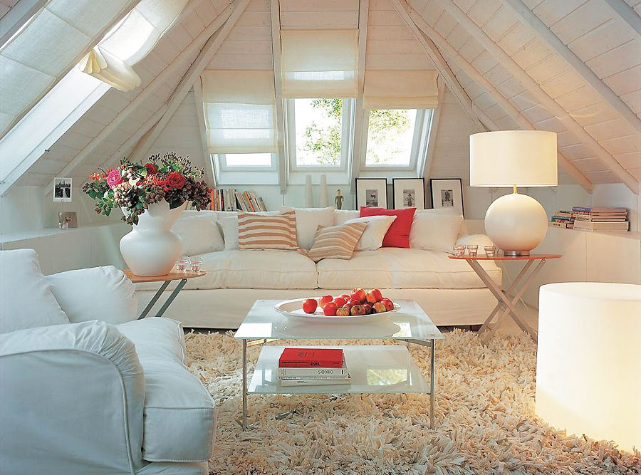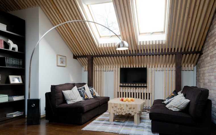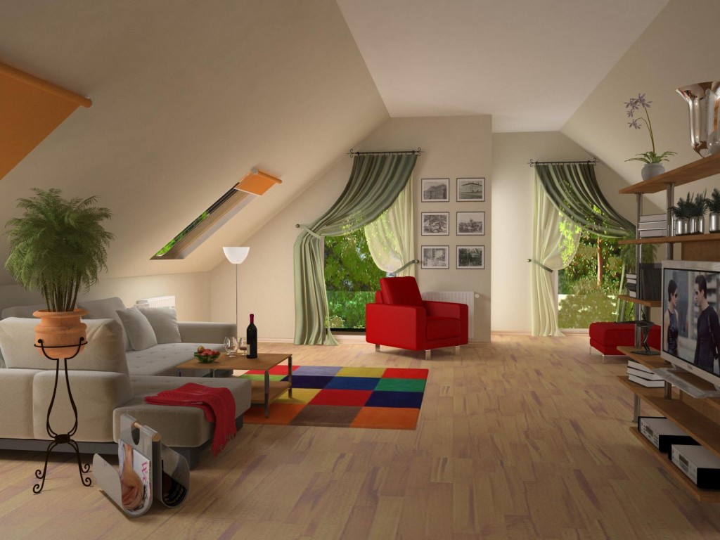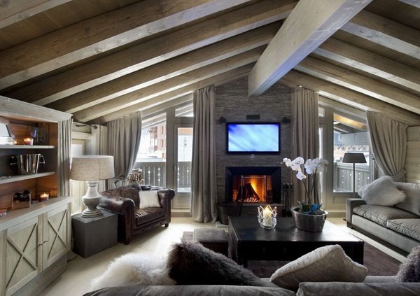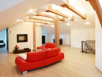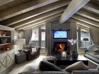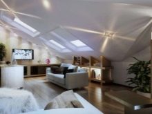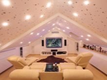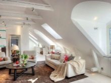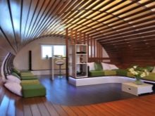 Si le toit a une perspective difficile, il convient de le niveler à l'aide d'un revêtement de finition de couleur claire. Le salon implique le confort, la chaleur et la création de l'atmosphère d'un foyer. Il a donc besoin de couleurs chaudes. Il n'est pas souhaitable de surcharger l'intérieur avec une abondance de meubles rembourrés. Si l’espace est petit, vous pouvez installer un petit canapé compact et quelques chaises.