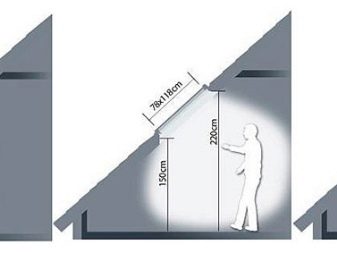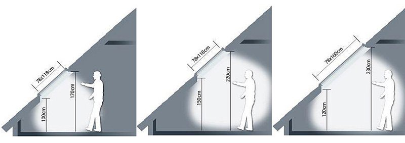 Si la même fenêtre est située à une distance de 120 à 150 cm, l'angle sera moins éclairé, mais le flux principal de lumière sera dirigé vers le centre de la pièce. Pour obtenir un éclairage optimal, il est préférable de choisir une fenêtre plus grande (par exemple, 78 x 160 cm) et de la placer à une hauteur de 120 cm du sol et presque jusqu'au sommet du toit (230 cm). Lors de la préparation, prenez en compte une nuance importante: plus la configuration du toit du grenier est abrupte, plus la fenêtre doit être large et haute. Cela a éliminé la destruction des chevrons du système.