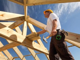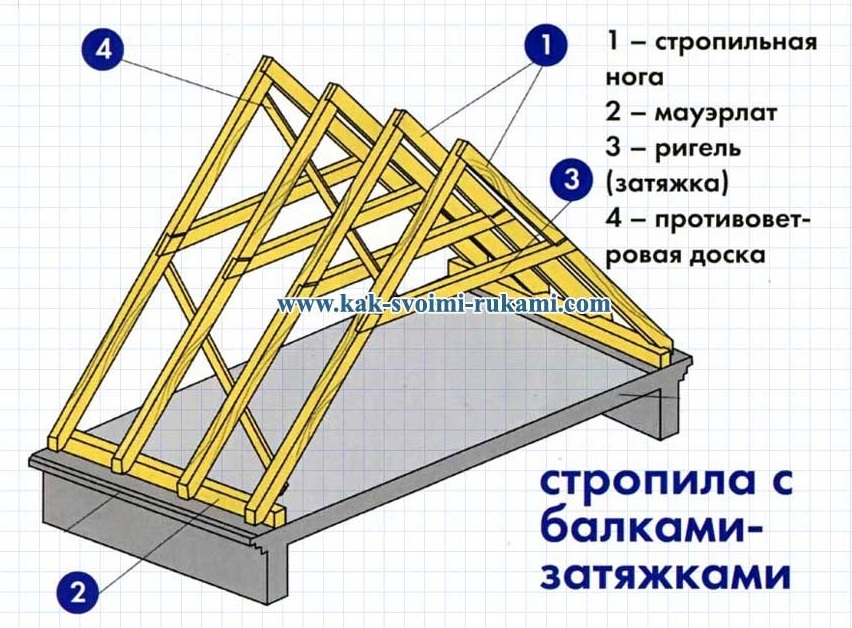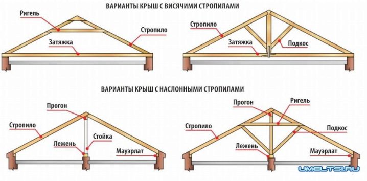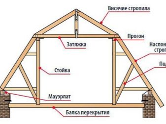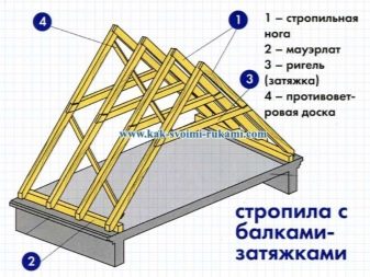 Les poutres sont en mauerlat. Sur le sol forment les pentes dans la mer de triangles. Si vous souhaitez effectuer un toit double, fixez d'abord le cadre sous la forme de la lettre "P". Après cela, les chevrons suspendus puis inclinés y sont directement fixés. Pour les faces latérales, utilisez des poutres inclinées.
