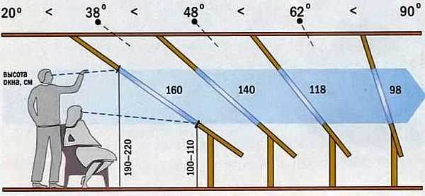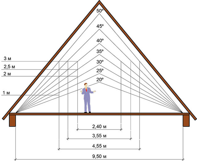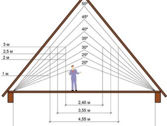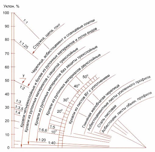 Outre les nuances d'isolation thermique et l'ordre des ouvertures des fenêtres, il est nécessaire de prendre en compte l'angle d'inclinaison de la pente du toit. Ce facteur est particulièrement important: si la pente de la pente du toit dépasse la valeur maximale autorisée, cela entraînera une diminution de la surface interne du grenier. Faites attention à la photo, en démontrant clairement les performances admissibles, en tenant compte du matériau utilisé pour la construction. Les valeurs sont exprimées en pourcentage; pour plus de compréhension, les ratios de quantités sont indiqués.