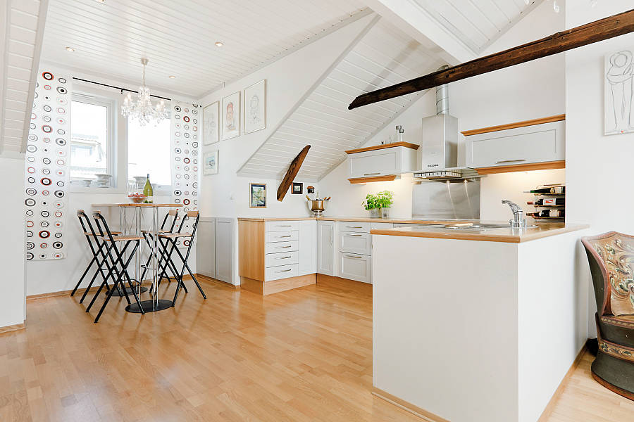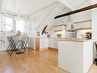 Si besoin thème rustique dans l'esprit du style provençal, il est possible de peindre les murs avec une peinture à base d’eau de couleur blanche ou teinte ivoire. Une telle solution de sol en bois va changer sa perception esthétique, la rendant facile. Les lustres ici ont besoin d'une forme simple et de petite taille. La forme du toit peut être pignon, hanche et cassée.