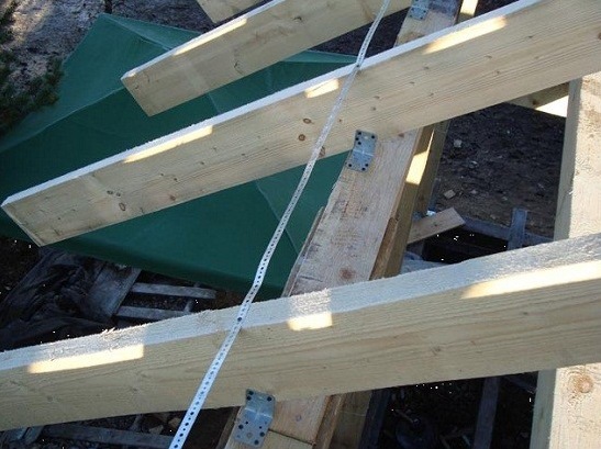 Pour obtenir une installation horizontale, tirez sur la corde entre les chevrons extrêmes. Lorsque tous les faisceaux sont installés, ils sont interconnectés, construisant une caisse. Les places réservées aux lucarnes, renforcées barre perpendiculaire. Cela éliminera la déformation des fenêtres à l'avenir.