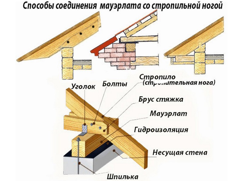 Mauerlat n’est qu’un harnais en bois sur la base. Sa tâche est de fournir les conditions pour une fixation ferme des chevrons inférieurs à la base. Il répartit la pression exercée par le poids du toit sur les murs. Il est fixé à la base au moyen de boulons d'ancrage, de goujons ou de renforts, fixant les planchers de roulement à la base. Utilisez nog en bois.
