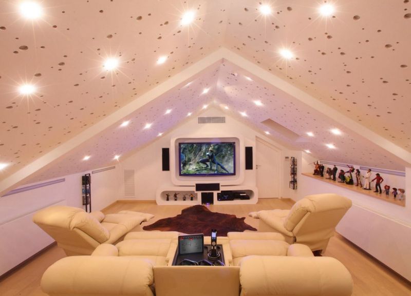 Ces sources lumineuses sont très puissantes, ne dégagent pas de substances toxiques dans l’air pendant leur fonctionnement, sont résistantes aux surtensions et ne chauffent pas. Cependant, ils émettent une lumière directionnelle qui ne permet pas d’éclairer chaque coin du toit en mansarde. Pour cette raison le plus souvent, le plafond du grenier est équipé d'un éclairage ponctuelsitué à la même distance autour du périmètre. Souvent dans le grenier, vous pouvez voir plusieurs lustres, ainsi que des luminaires composites composés d'éléments centraux et auxiliaires.