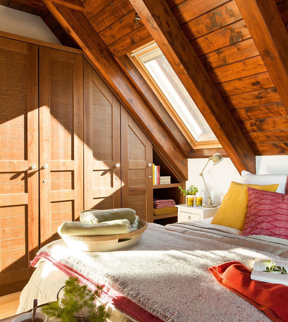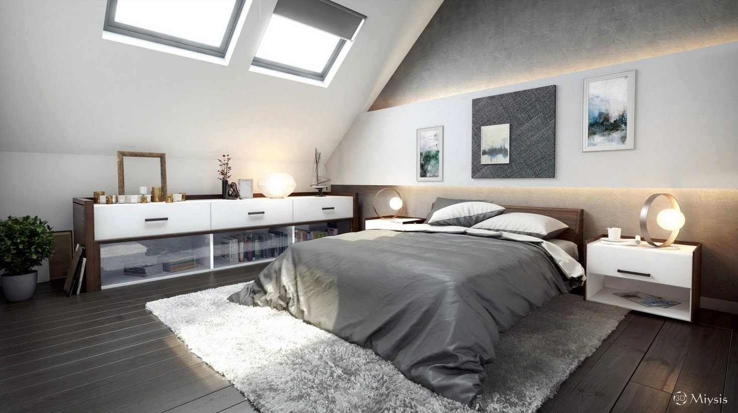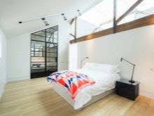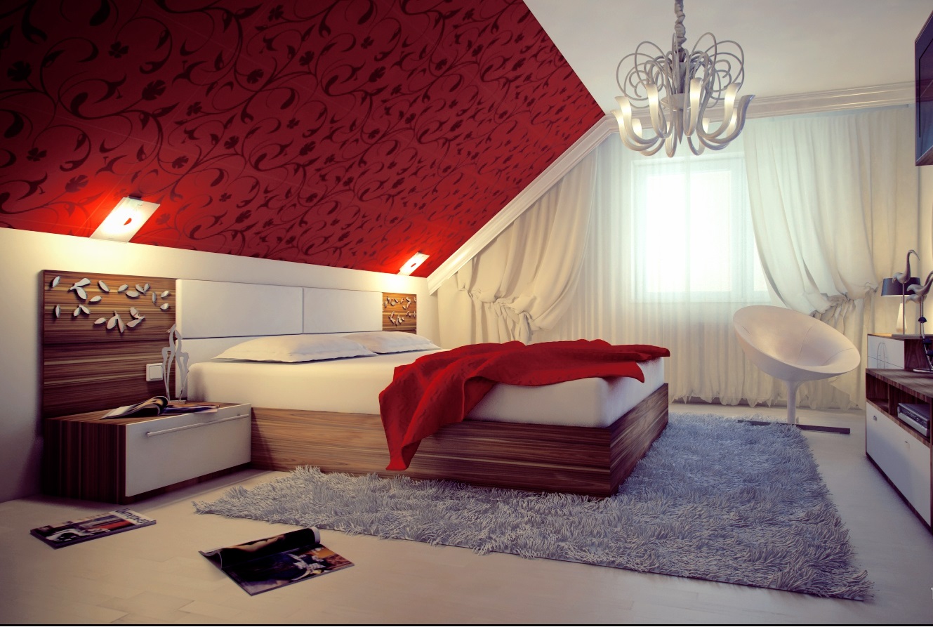 Dans le grenier, les chambres sont souvent faites et le nombre de belles options est tout simplement énorme. Voici un exemple de la façon dont le mur rouge «suspendu» est en harmonie avec la couverture décorative rouge du lit et, en raison de la composition précise de la composition, tout semble très attrayant. Le mur opposé à la bande lumineuse est peint dans diverses nuances de noir et de blanc. Les exigences pour le choix de la composition pour peindre le grenier sont les mêmes que dans d’autres parties de la maison (protection contre l’humidité, la lumière du soleil dans certaines situations, etc.).