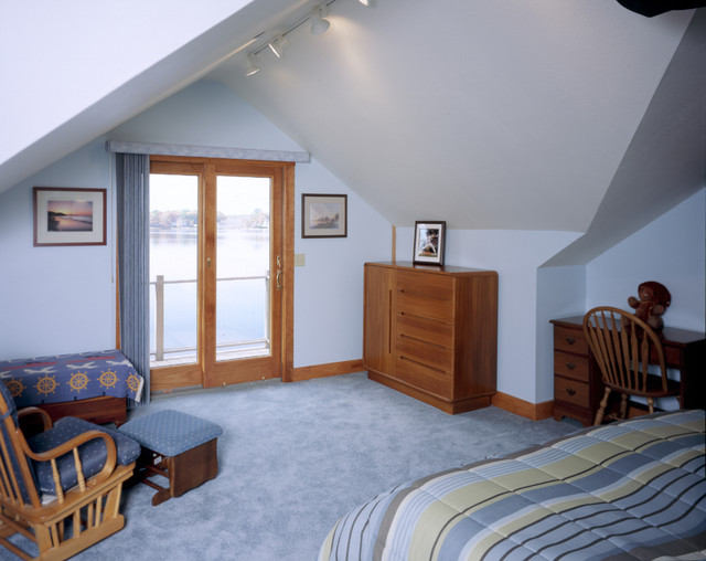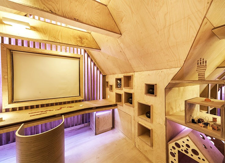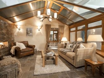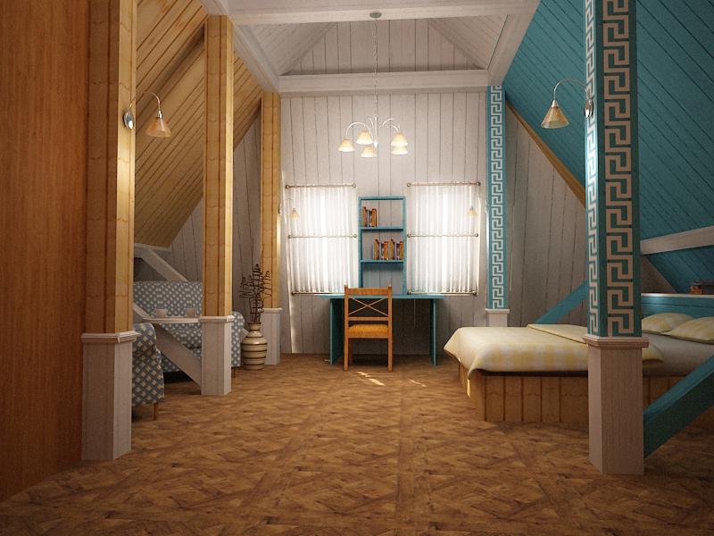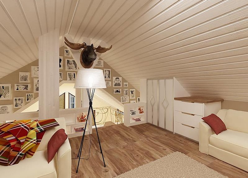 Lors de l’organisation de la datcha, de nombreux propriétaires terriens ont également recours aux combles. Voici une de ces solutions, qui utilise un certain nombre de mouvements de décoration atypiques - qui vaut au moins un mur jonché de photos de famille ou une maquette de tête d’orignal posée sur une lampe. À propos de la perfection de la conception de l'intérieur dit au moins à quel point les accents de couleurs vives sont placés de manière appropriée aux différents points de la pièce. Le sol de l'exquis linoléum brun clair est bien entendu perçu positivement.