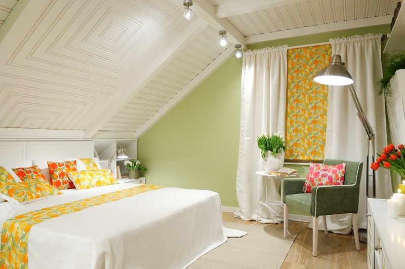 Beaucoup de mansards sont recouverts de papier peint à l'intérieur. Voici un exemple: le papier peint est rarement utilisé pour couvrir les murs, ils ont une couleur et une texture aussi lisse et non exprimée. Même une télévision à l'ancienne dans le fossé entre deux fenêtres attire beaucoup plus l'attention.